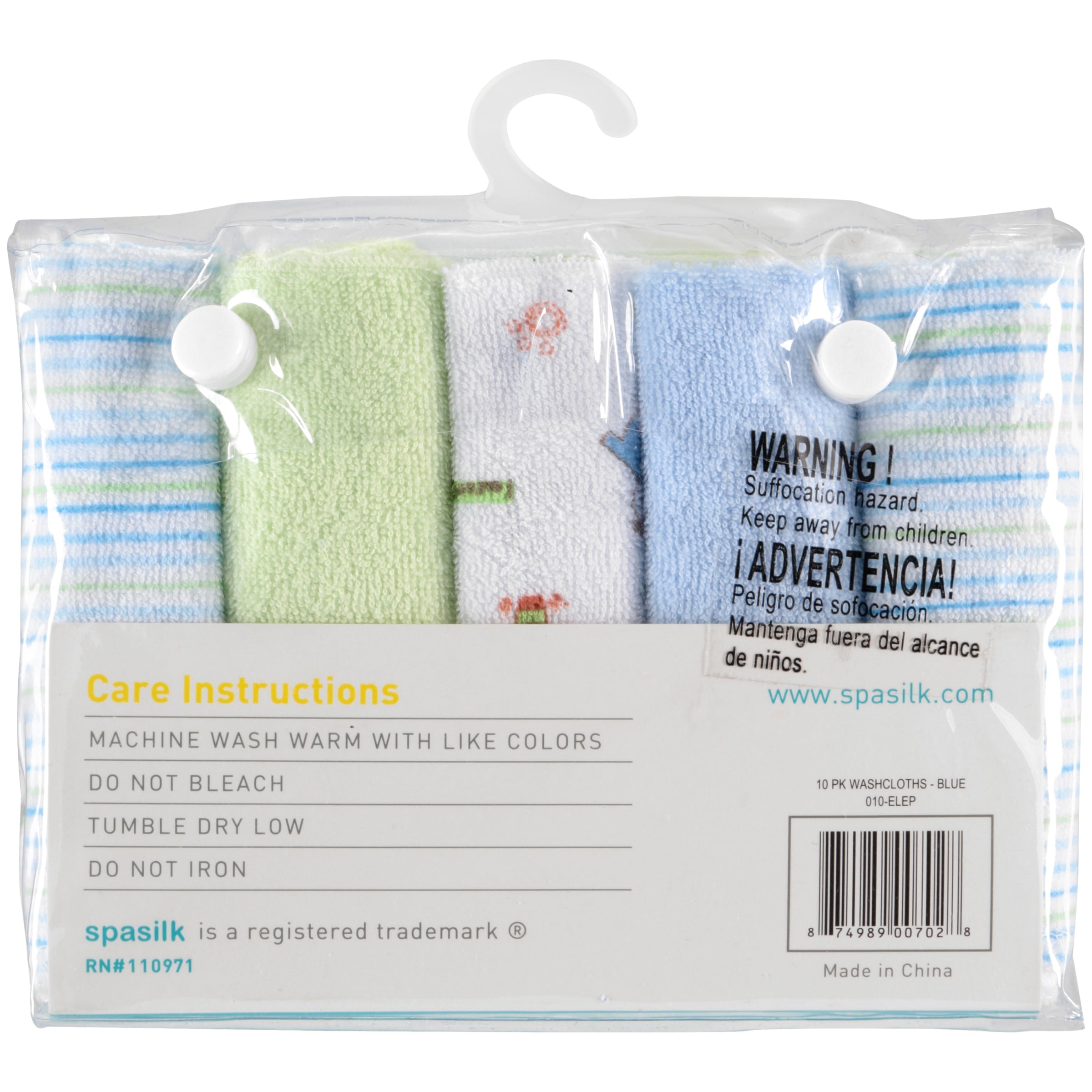 - Other Details: The blue elephants washcloths are made of 80% cotton and 20% poly, and are machine washable.