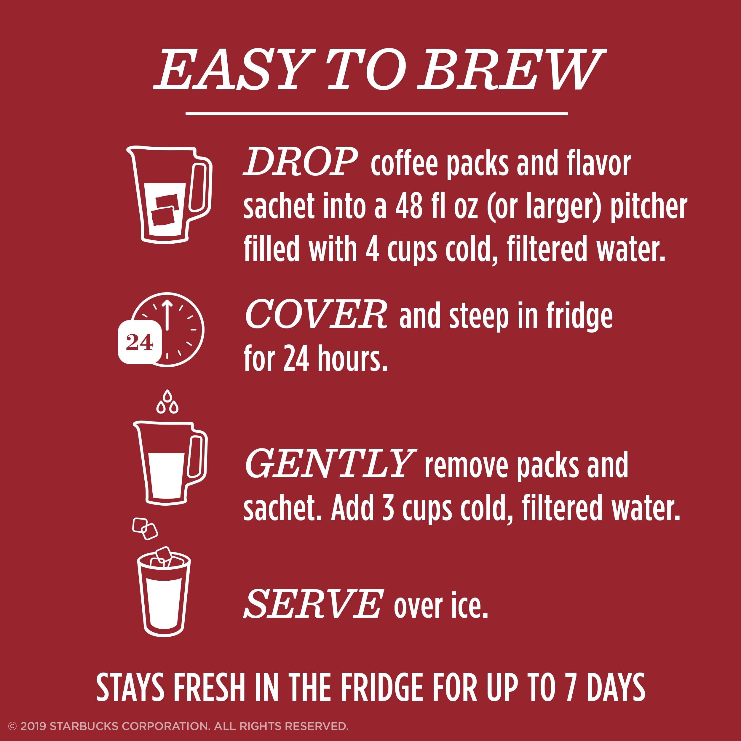 - How to Brew: Drop the coffee pitcher packs and flavor sachet in a pitcher of water for 24 hours for a bold, super-smooth cold brew coffee that can be enjoyed at any time