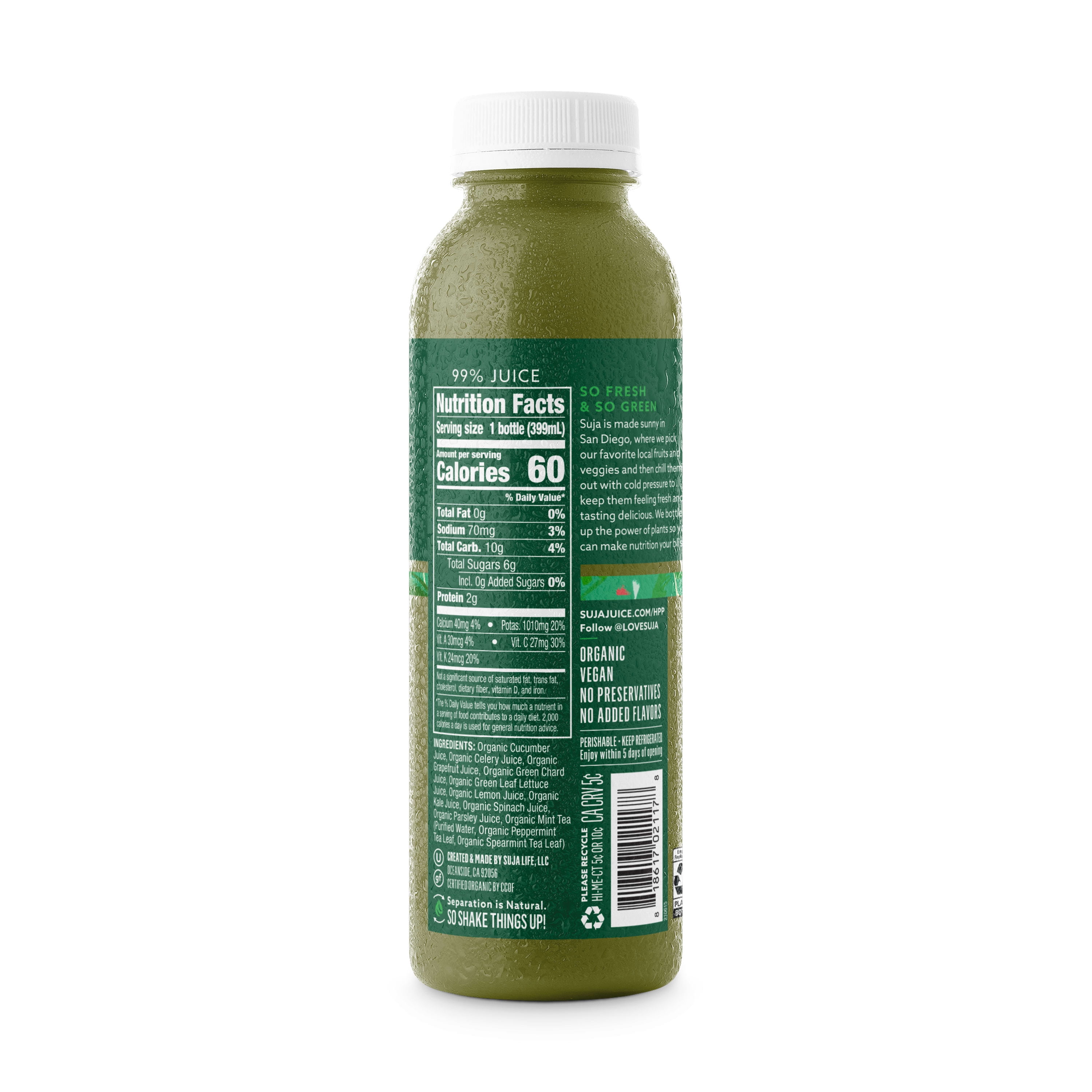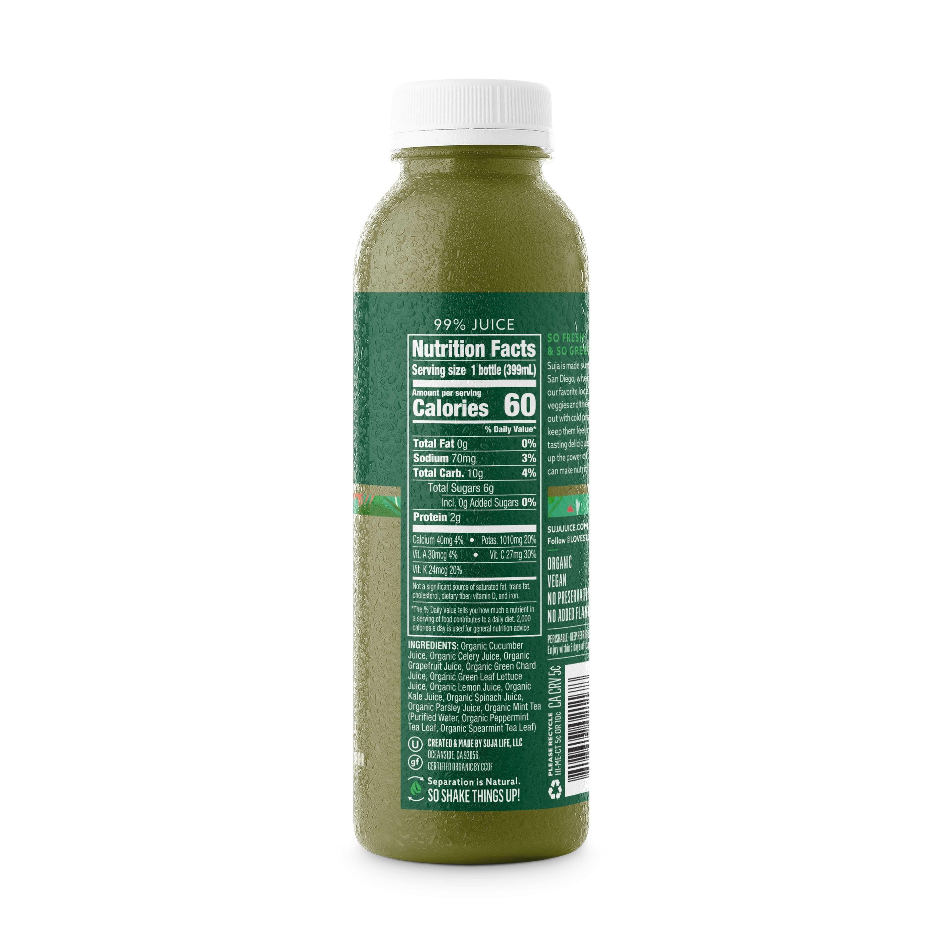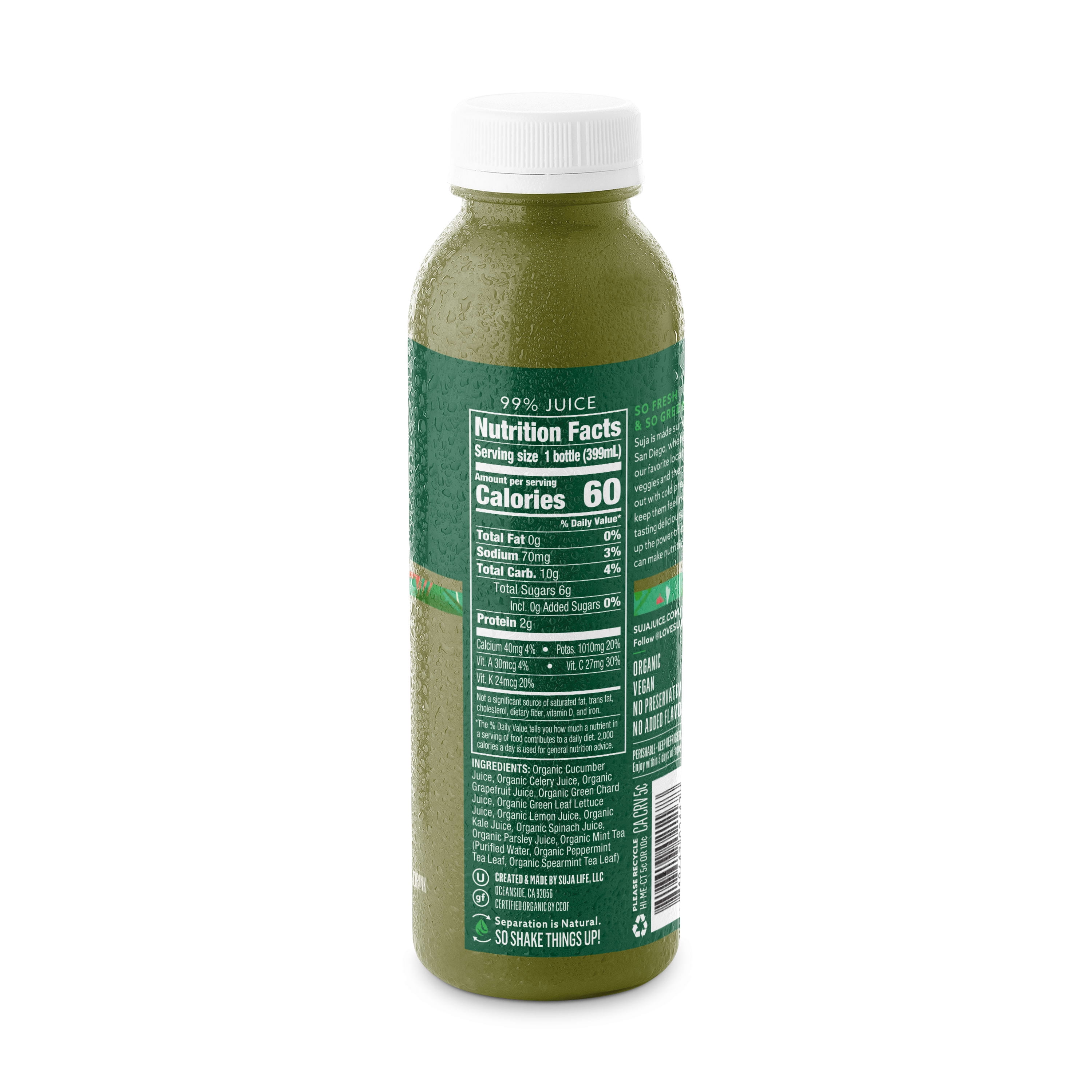 So fresh and so green, Suja Organic Cold-Pressed Uber Greens is an earthy, nutrient dense green juice full of leafy greens, tangy citrus and revitalizing mint tea and is the best way to drink your veggies and gulp your greens. Featuring cucumber, celery, grapefruit, green chard, green leaf lettuce, lemon, kale, spinach, parsley, peppermint and spearmint tea. Suja Organic Cold-Pressed Uber Greens is USDA Certified Organic, Non-GMO Project Verified, Gluten-free, Dairy-free, vegan, and high pressure processed (HPP) to maintain nutrients and fresh taste. Suja is made sunny in San Diego, where we pick our favorite local fruits and veggies and then chill them out with cold pressure to keep them feeling fresh and tasting delicious. We bottle up the power of plants so you can make nutrition your bliss!