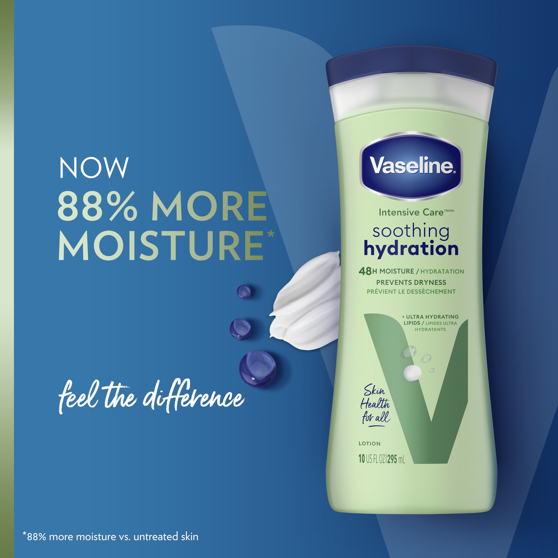 Made with aloe vera and a special blend of Vaseline Jelly, Vaseline Intensive Care Soothing Hydration Body Lotion helps keep your skin looking healthy and fresh. Clinically proven to keep skin healed for 3 weeks, after using daily for 4 weeks in a clinical study, this non-greasy, fast absorbing skin lotion is your go-to dry skin moisturizer.Deep Moisturizing Daily Body Lotion for Dry SkinVaseline’s moisturizing lotion goes beyond basic moisturization. Our Intensive Care range works to heal dry skin deep down. Vaseline Intensive Care Soothing Hydration Lotion contains glycerin which draws moisture to the skin, and healing micro-droplets of Vaseline Jelly that lock in moisture. The formula used in this body moisturizer for dry skin restores the essential moisture your skin needs with a blend of nourishing ingredients.With daily exposure to environmental triggers (like wind, lack of humidity & sun) skin’s natural moisture barrier can break down, allowing for water to escape the skin. The healing micro-droplets of Vaseline Jelly in our dry skin lotion locks in moisture to allow the skin’s natural barrier to recover. Smooth, hydrated skin can be yours with Vaseline Intensive Care Soothing Hydration Lotion.Vaseline Soothing Hydration Lotion is also infused with aloe vera and has a soft, calming fragrance. This lotion is the ideal moisturizer for relieving everyday dryness, as well as soothing dryness associated with sunburn.