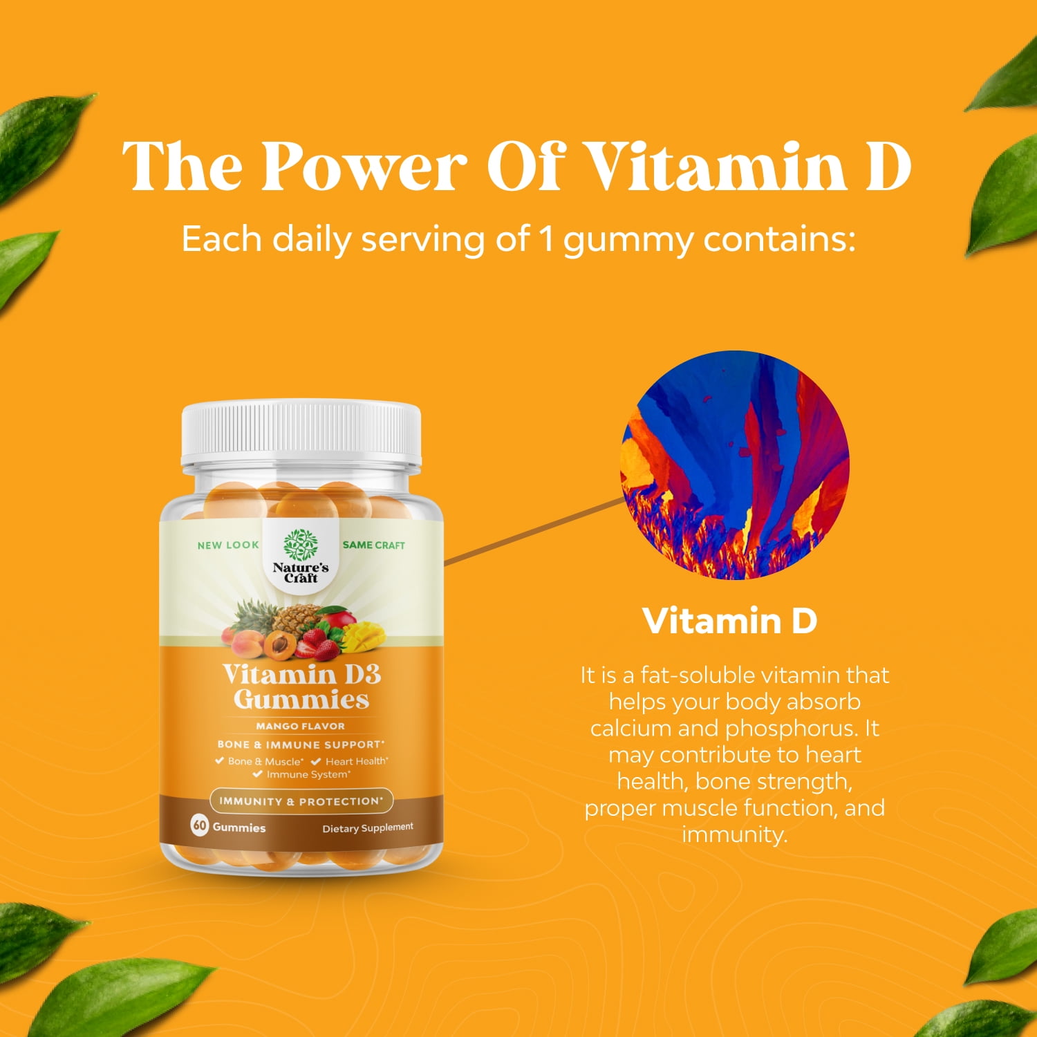 Vitamin D is arguably the most essential nutrient for maintaining a healthy body but most people don’t get enough of this vital vitamin. That’s why we’ve made it easier and more delicious than ever to keep your body at its best with 5000IU of vitamin D3. Instead of worrying about pills or tablets, we’ve formulated a delicious and nutritious gummy vitamin because we believe wellness can be enjoyable too. Besides for our premium quality ingredients, we are also proud that our gummy vitamin is free of gelatin, artificial dyes and colors, and is vegan-friendly. Remember: At Nature’s Craft, we use only the purest, most potent and high-quality ingredients available in our vitamin D3 gummy supplement. We do this because we want our products to work for you time and again. We want you to be a customer for life!