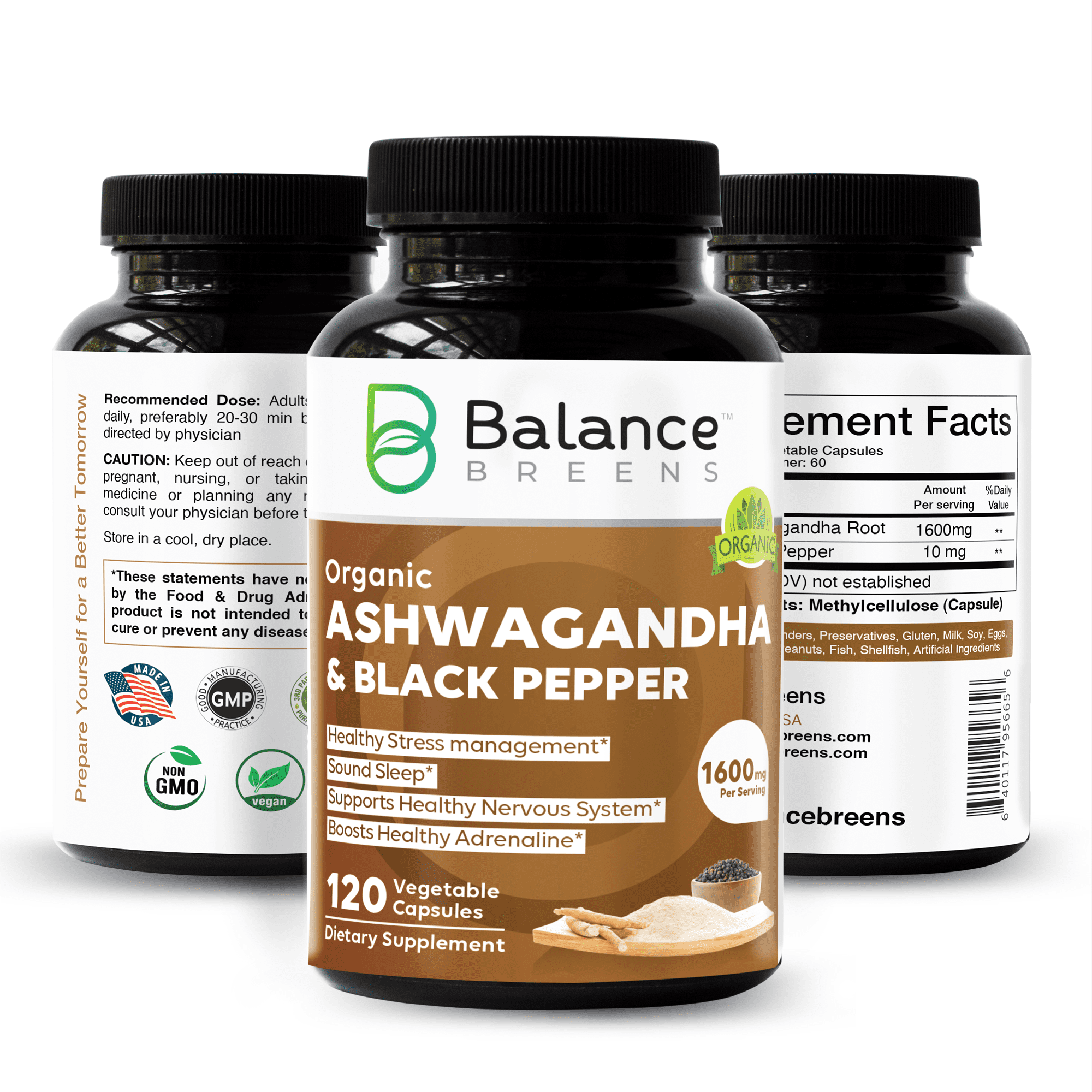 Balance Breens Organic Ashwagandha 1600mg with Black Pepper Supplement – 120 Capsules – Stress and Anxiety Relief – Gluten Free & Non-GMO