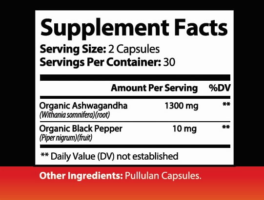 Ashwagandha 1300mg Pure Organic Root Powder with Black Pepper Extract, Stress Relief, Mood Support, 60 Veggie Capsules