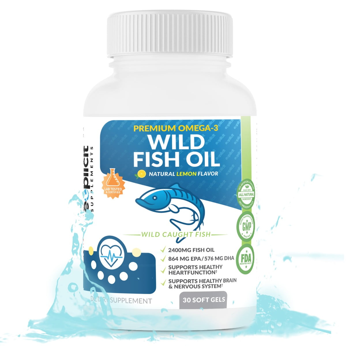 Wild Fish Oil Omega 3 2400mg – EPA/DHA – Burpless, Lemon Flavored Non-GMO, Gluten & Soy Free – 1 Month – eXplicit Supplements