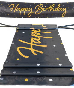 Happy Birthday Yard Sign Banner, 117 x 19 Inch, Black/Gold, Outdoor Birthday Decorations for Lawn, Fence and Trees, Durable Polyester Cloth Material