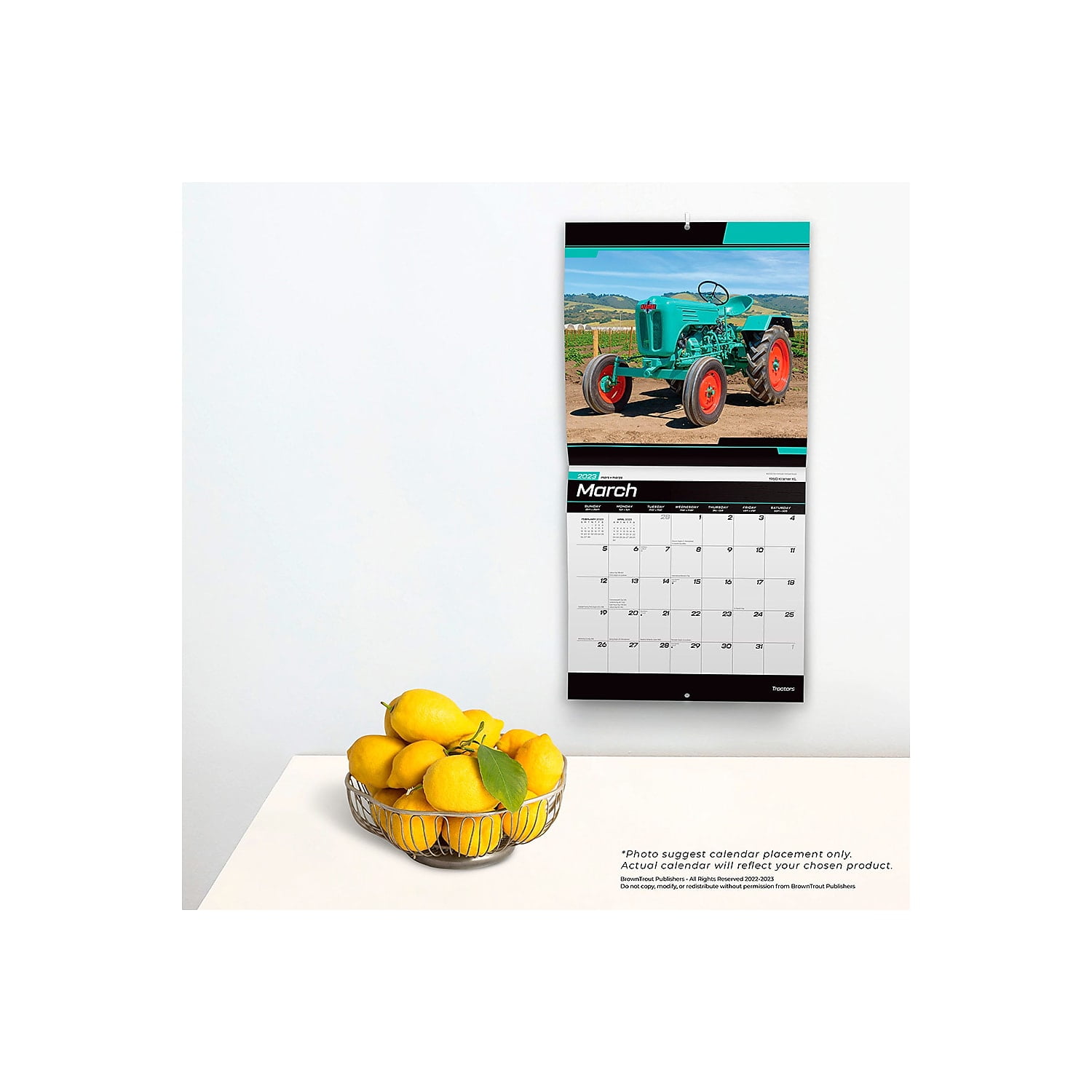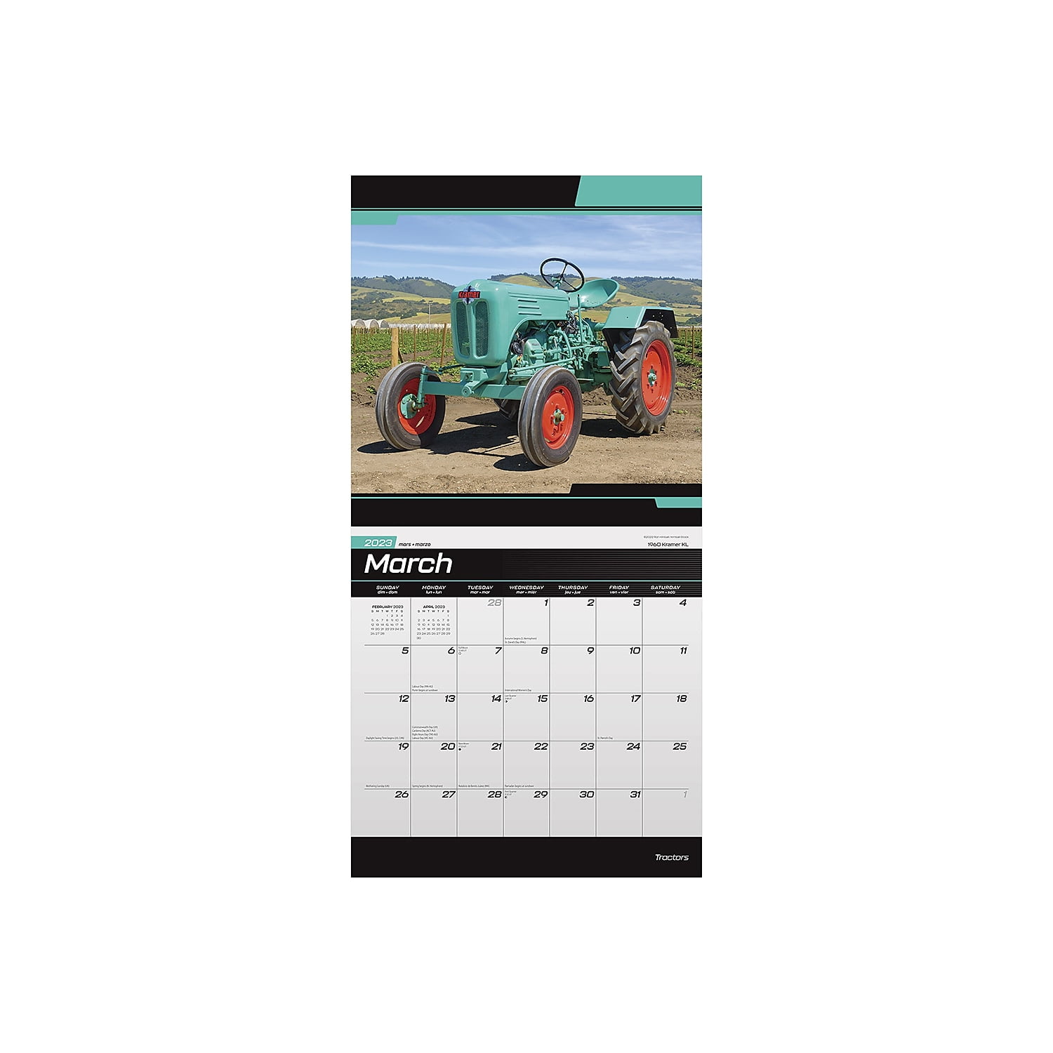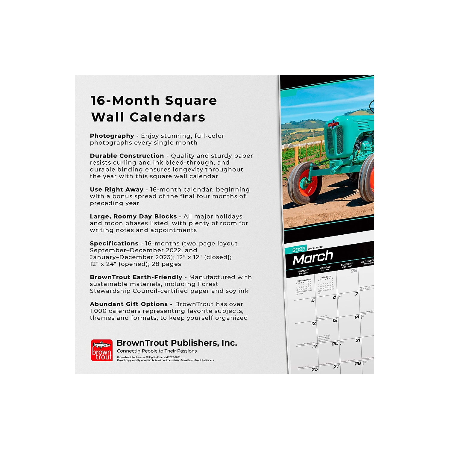 Tractors 2023 12 x 12 Inch Monthly Square Wall Calendar BrownTrout Farm Rural CountrySteam-powered tractors have been around since the mid-1800s, but it was the internal combustion models of the early 20th century that truly revolutionized the world of agriculture. Weary draft animals and overworked farmers suddenly got an enormous helping hand in their never-ending struggle to plow large spreads of land and pull heavy loads from field to field. Celebrate the beauty of tractors in both function and form in this one-of-a-kind wall calendar. Classic square format. Updated style. Our wall calendars include stunning images and even clearer grids and text. Filled with an abundance of holidays, each month’s grid is large enough for daily tasks and appointments. Photography – Enjoy stunning, full-color photographs every single month. Durable Construction – Quality and sturdy paper resists curling and ink bleed-through, and durable binding ensures longevity throughout the year. Use Right Away – 16-month calendar, beginning with a bonus spread of the final four months of preceding year. Large, Roomy Day Blocks – All major holidays and moon phases listed, with plenty of room for writing notes and appointments. Specifications – 16-months (two-page layout September–December 2022, and January–December 2023); 12"" x 12"" (closed); 12"" x 24"" (opened); 28 pages. Earth-Friendly – Manufactured with sustainable materials, including Forest Stewardship Council-certified paper and soy ink. Abundant Gift Options – Over 1,000 calendars representing favorite subjects, themes and formats, to keep yourself organized. 2023 Wall Calendar. Not a Dry Erase Calendar. 12"" x 12"". Monthly. January 2023 – December 2023. Tractors. Recycled. This product is manufactured by BrownTrout. Sold as 1 Each.