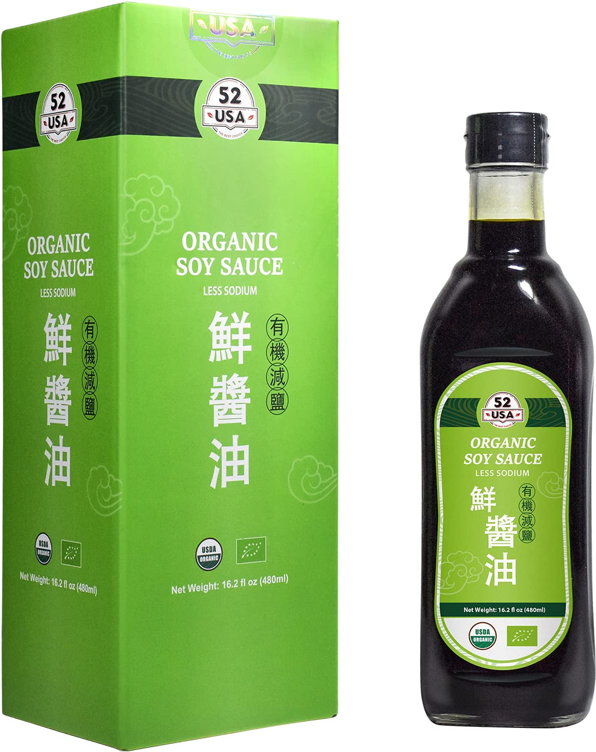 52USA Organic Low Sodium Soy Sauce 16.2oz(480ml), Naturally Brewed Soy Sauce Marinade for Marinating Fish, Meat & Roasted Vegetables