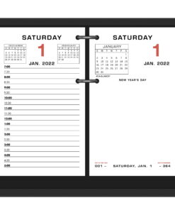 Schedule your day right down to the quarter-hour with this classic daily appointment book. Dated planning pages range 12 months from January to December. One-page-per-weekday format features quarter-hourly appointment times from 7 AM to 7:45 PM, and count of days/days remaining. The past, current and two future months reference stretches across two pages. The current reference month is boxed, and the current two days are highlighted for easy identification. Each Saturday has quarter-hourly appointments from 9 AM to 4:45 PM. Wirebound, nonrefillable appointment book also has a simulated leather cover to protect your planning pages.