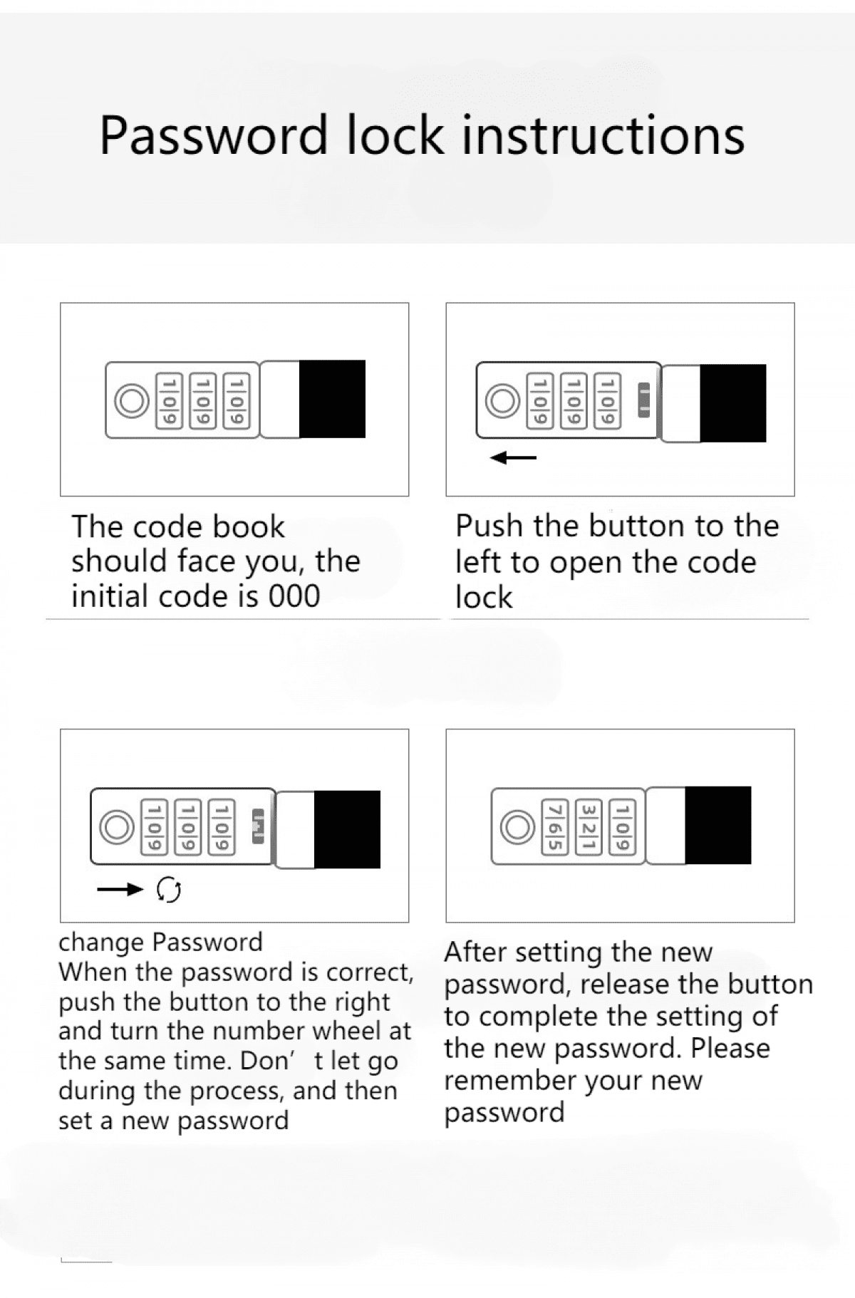 When the password is correct, push the button to the right and turn the number wheel at the same time. Don’t let go during the process, and then set a new password
