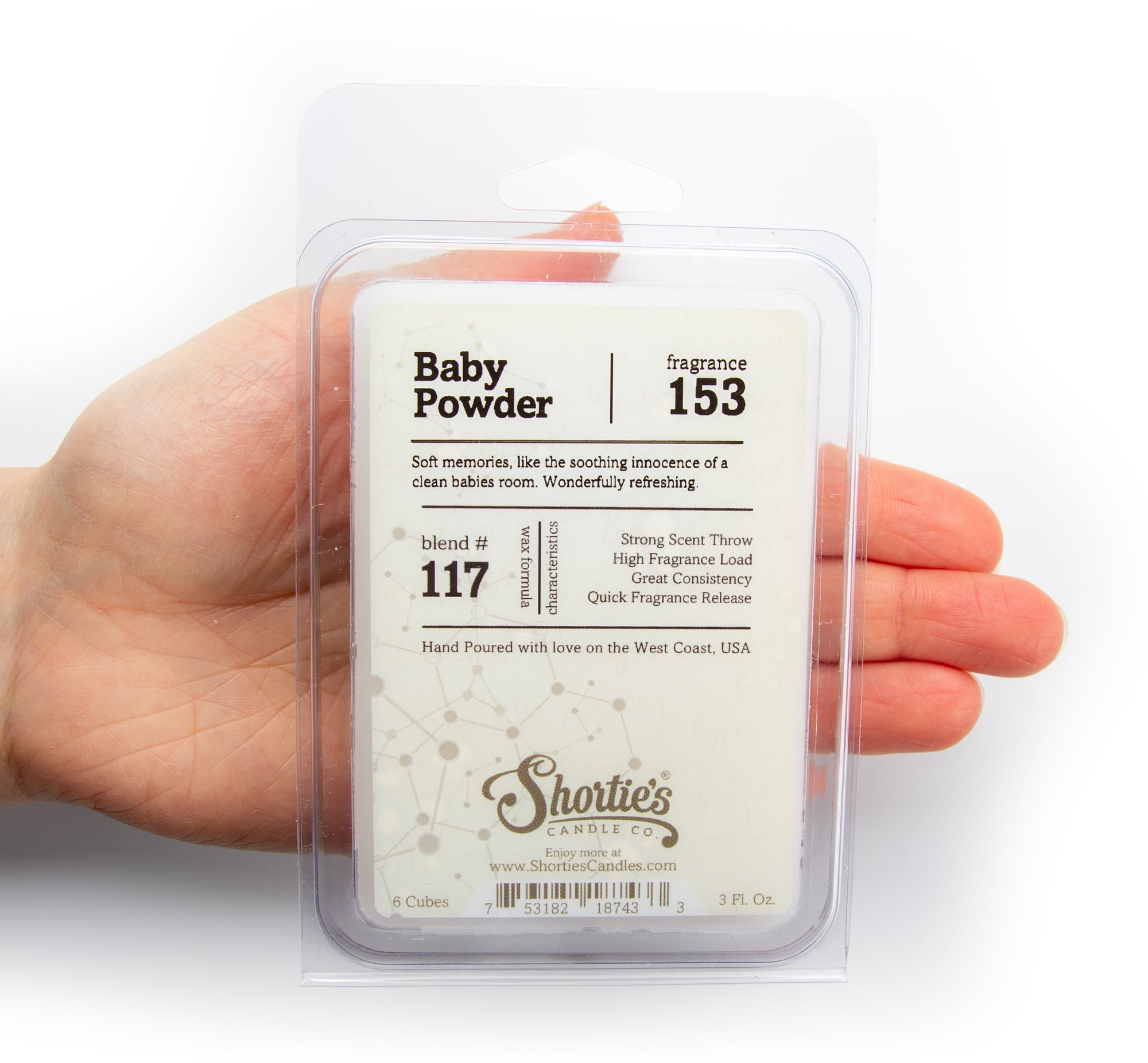 Welcome home the soft, soothing fragrance of baby powder. Whether you want to freshen up your baby’s room, relive those special moments of innocence, or just love the clean scent. Our Premium Baby Powder Wax Melts are highly scented, made with Essential and Natural fragrance oils, and are completely phthalate free, vegan, and non toxic! Each pack of Wax Melts contain 6 1/2 Oz. warmer wax cubes, and each will provide strong fragrance for 8+ hours. Our Premium Wax Melts are a completely safe flameless fragrance wickless candle option for any space and pets of all types. Our Formula 117 wax blend is made with a soft paraffin, and is designed for maximum scent throw. This new formula also comes out of the package much easier than our classic formula. Truly an experiment, but one we really like!