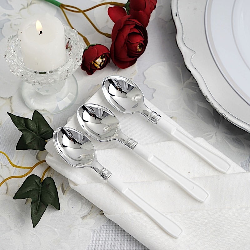 BalsaCircle 36 Pieces 5′ Silver Disposable Plastic Spoons White Handle Silverware