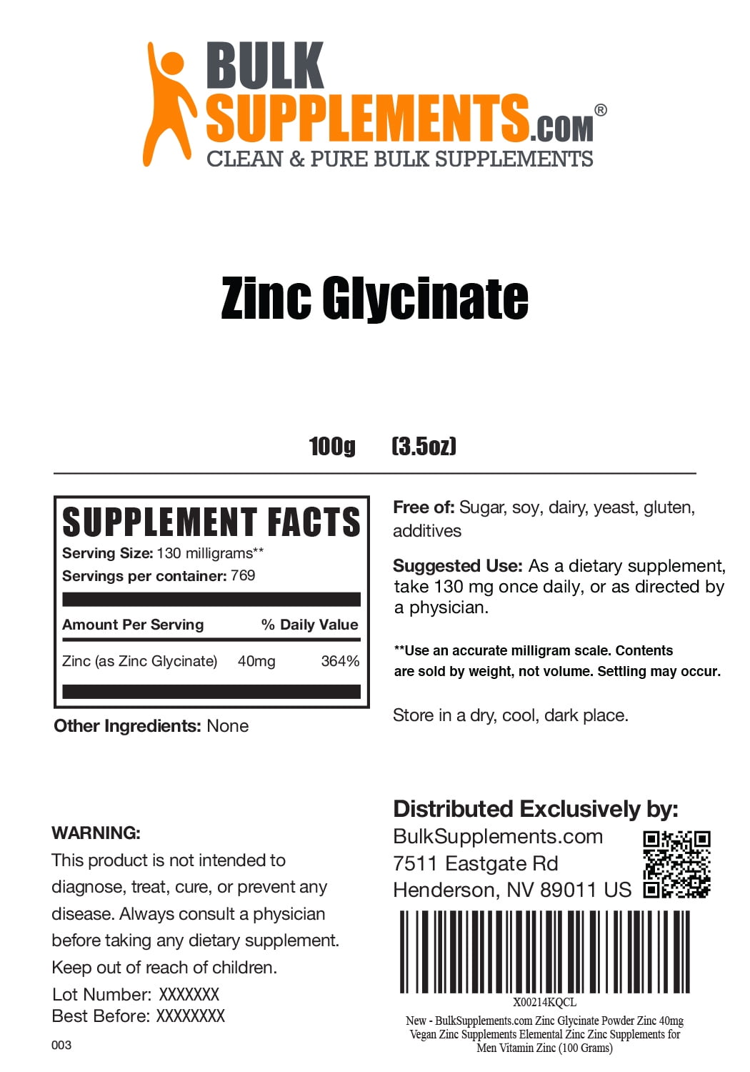 BulkSupplements.com Zinc Glycinate Powder – Zinc 40mg – Vegan Zinc Supplements – Elemental Zinc – Zinc Supplements for Men – Vitamin Zinc (100 Grams)
