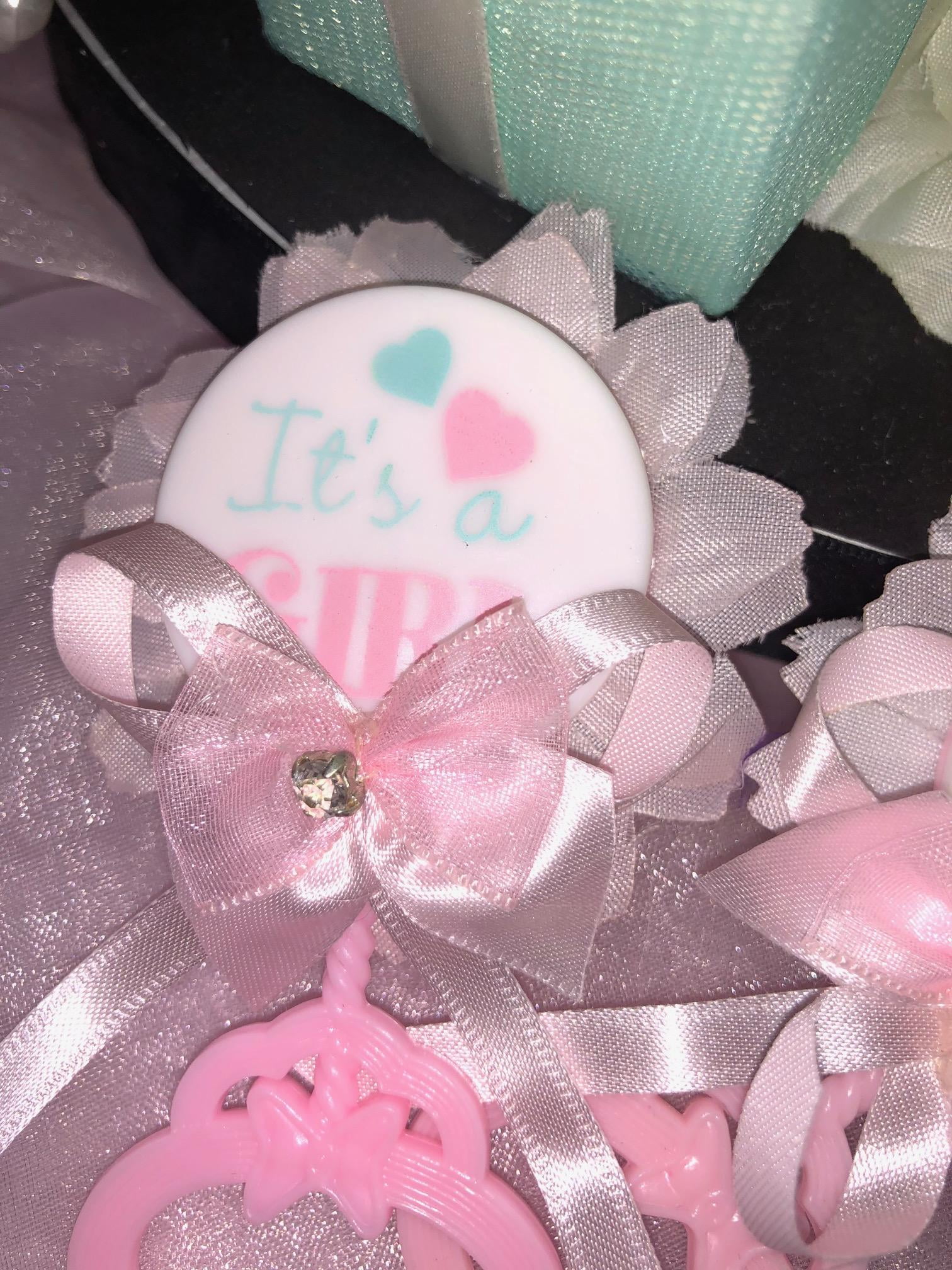 Adorable Rattle Baby shower favor for someone you love. Pin-back favor for your guests. "It’s a Girl" in pink color. Rattle measures 1.5" x 3 1/4"; Decorated with flower, ribbon and rhinestone.plastic rattle; pin-back favor
