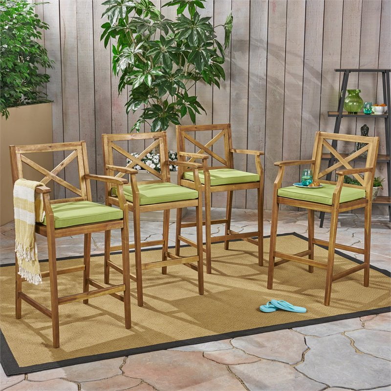 Give your outdoor dining or bar area a coastal vibe with this set of four acacia wood barstools. This clean and streamlined design is constructed from 100% acacia wood and boasts tasteful, comfortable, and weather-resistant cushions. Bring the resort home with you; the fun won’t ever have to end.