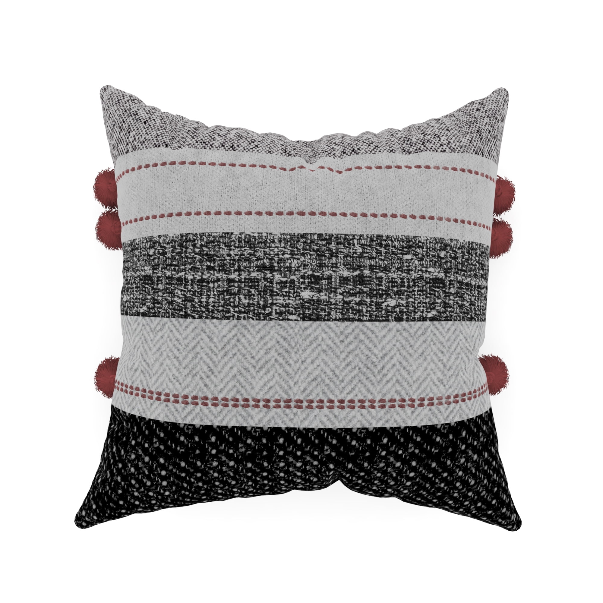 Decorative Throw Pillow Cover, 18 x 18, Black and White, Printed Embroidery and Patchwork Stripe on Poly Chenille with Tassels Creating an Effortlessly Modern Sense of Style for Bed and Sofa
