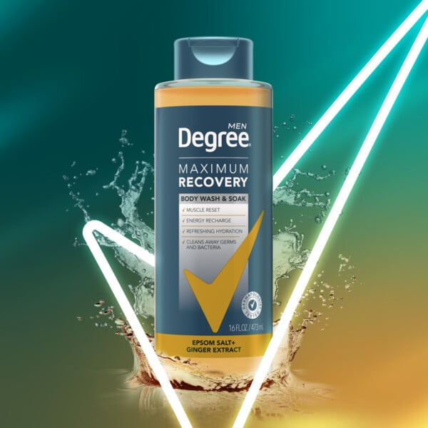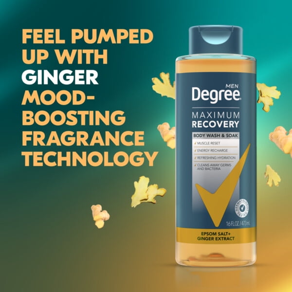 - Level up your post-workout shower game. Degree Men Maximum Recovery Ginger Body Wash works with the power of hot water to help you recover after a workout.