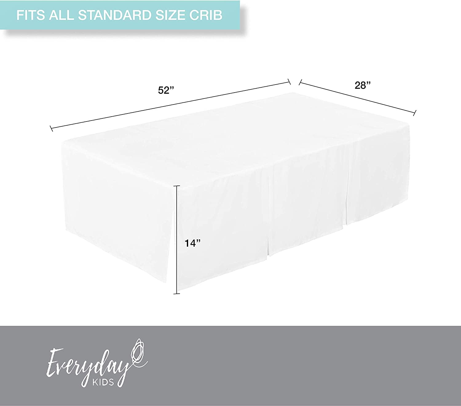 EVERYDAY KIDS White Pleated Crib SkirtEveryday Kids Pleated Crib Bed Skirt – A Must Have For Your Nursery Use Everyday Kids modern, sleek multipurpose crib bed skirt to complete your warm loving nursery, discreetly hide storage under the crib, our crib ruffle is long enough to keep your storage hidden, can be used as a toddler bed ruffle. Everyday Kids pleated 100% cotton crib skirt adds a touch of softness to your crib. Decking is made of durable strong cotton to protect your crib mattress from the crib spring board. The bed skirt is 14" long with a finished hem and split corners, making our product easy to put on and take off the crib. No hassle easy care. Machine wash in cold with like colors. Tumble dry low heat. Iron low heat as needed. Product Details: CLASSIC PLEATED: Everyday Kids extra-long classic crib dust ruffle is styled with inverted pleats for a soft tailored finished look. Add the finishing touch to your nursery or toddler bed with our pleated crib skirt. HIGHEST QUALITY FABRIC: The ruffles are made of 100% natural cotton while the platform is made of 100% microfiber polyester. Our crib bed skirt is breathable, soft, gentle, which also pass CPSIA test requirements and meet CPSC standards. All our concern is to bring your baby a warm and cozy nursery room to slumber and dream. SAFE FIT: Measuring 28" x 52" with 14” drop, this crib skirt fits perfectly on all standard cribs and most toddler beds. The 14” length is long enough to discreetly hide storage under the crib. Finished with 4 split corners to make placement around crib posts easy and make changing and washing stress free. EASY CARE: Durable Use & Machine Washable: Machine washable on gentle cycle. Tumble dry on low heat or line dry. TOP RATED CUSTOMER SERVICE – All of our products are free of harmful chemicals and made using carefully selected fabrics down to the best fibers so that your child can be safe and comfortable and you can be worry-free. We offer a 30-Day money back guarantee on all of our items. Our US-based customer service representative will answer your request within 24 hours.