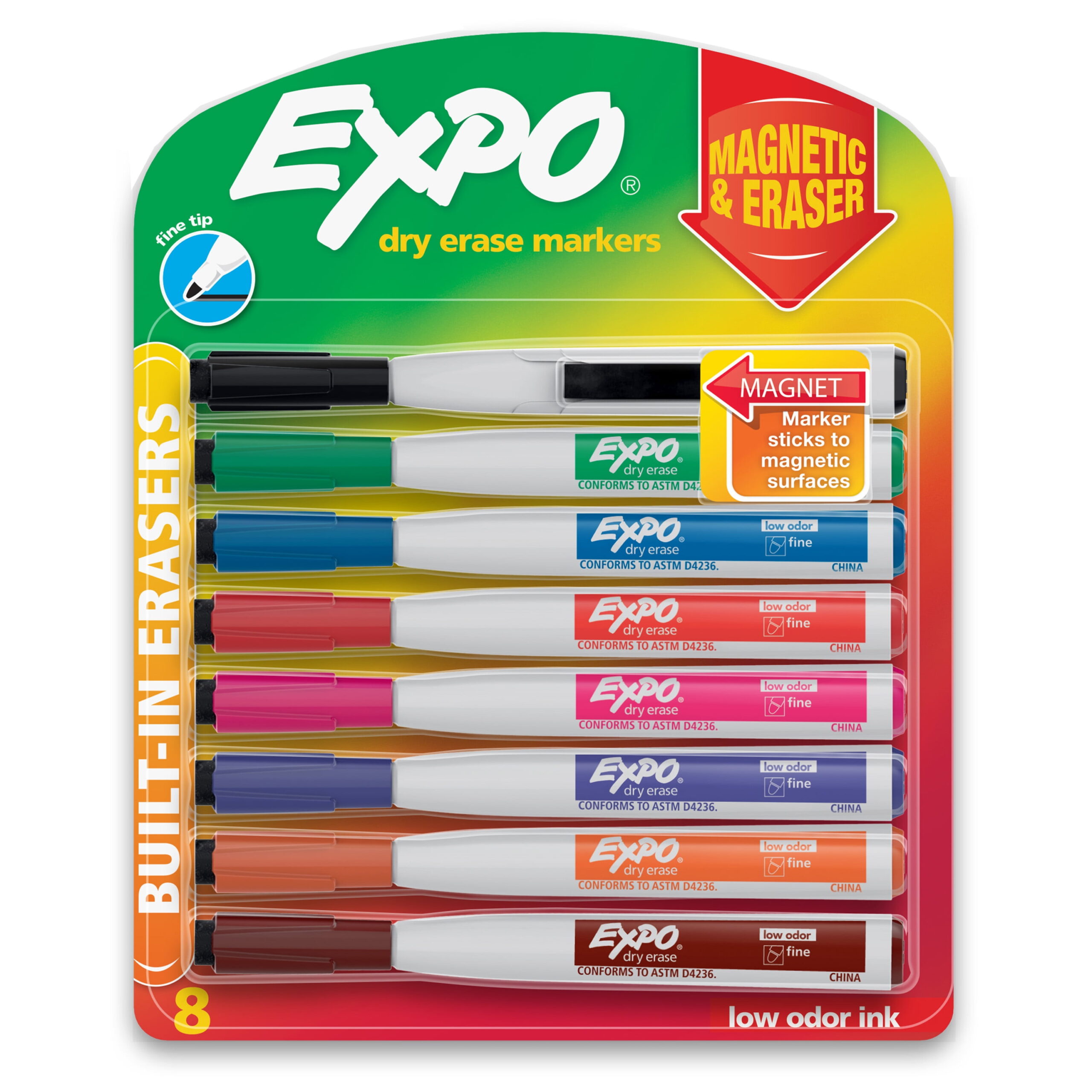 Expo Magnetic Dry Erase Markers with Eraser, Fine Tip, Assorted, 8 Pack