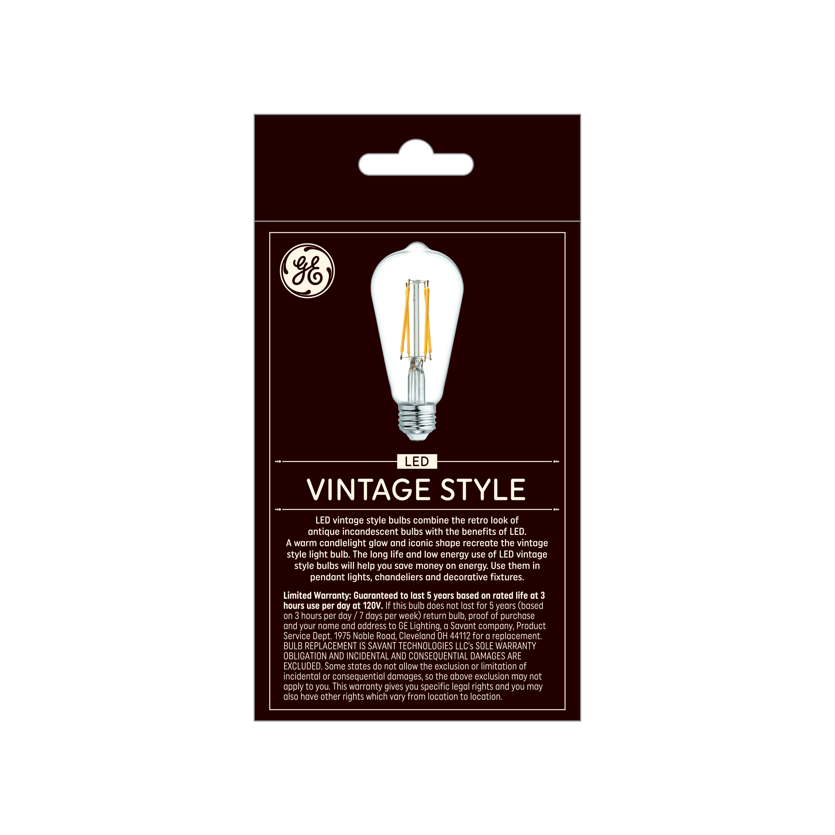 GE’s Vintage Style LED ST19 general purpose light bulb combines the retro look of antique incandescent bulbs with the benefits of LED. A dimmable warm, candlelight glow and clear finished glass recreate the vintage style light bulb. The long life and low energy use of GE LED vintage style bulbs will help you save money on energy. Use it in table lamps, pendants, and decorative fixtures. LED Technology, 6W of Energy Usage, Vintage Clear Finish, Straight Filament, Standard Base (E26), Mercury Free, 560 Lumens