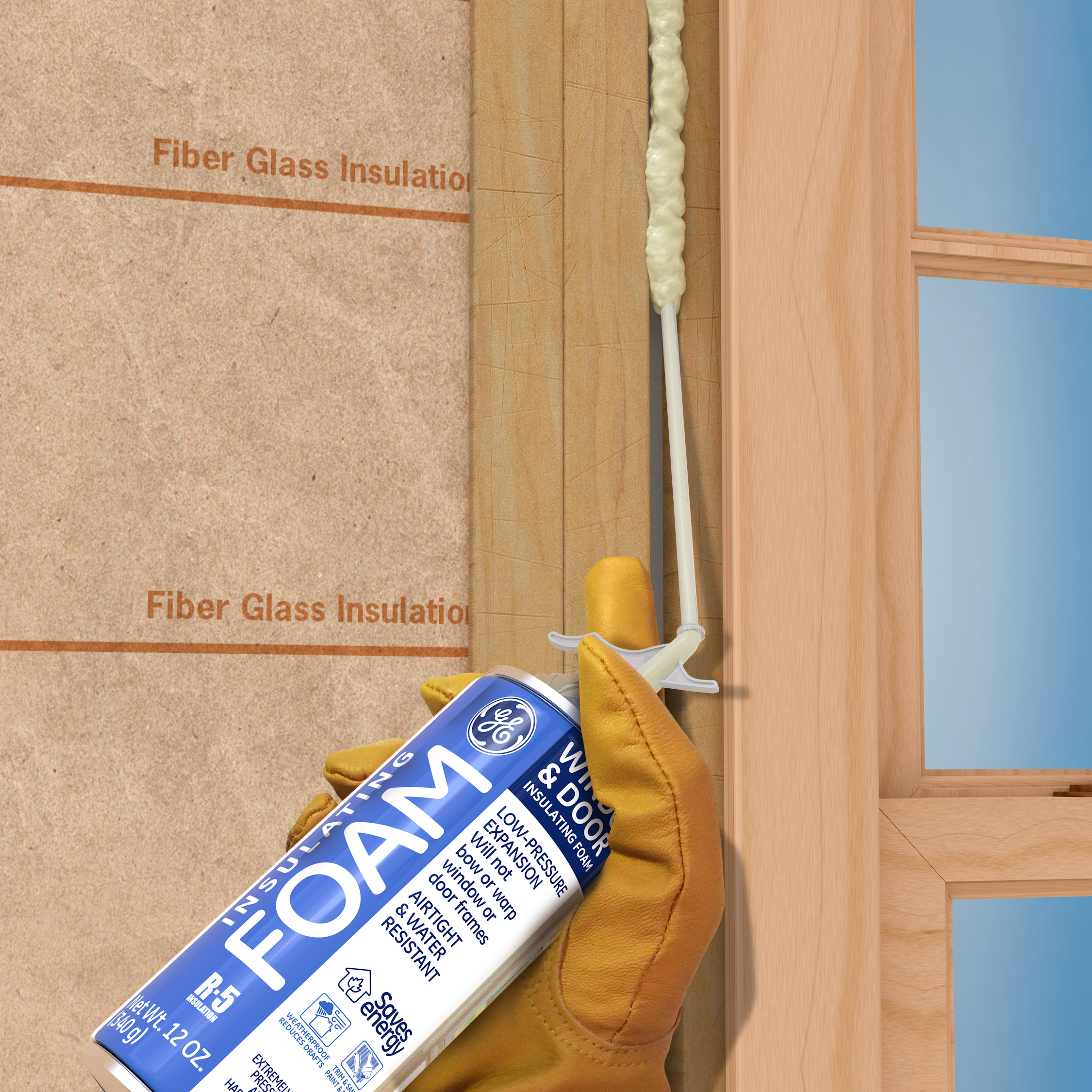 Seal gaps and cracks around window and door frames with GENERAL ELECTRIC – branded Window & Door insulating foam, a low-pressure and low-expansion foam that remains waterproof with an airtight seal.