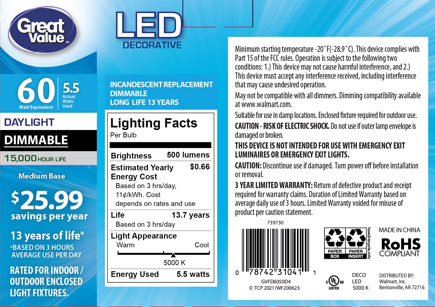 Great Value LED Light Bulb, 5.5 Watts (60W Equivalent) B10 Deco Lamp E26 Medium Base, Dimmable, Daylight, 4-Pack