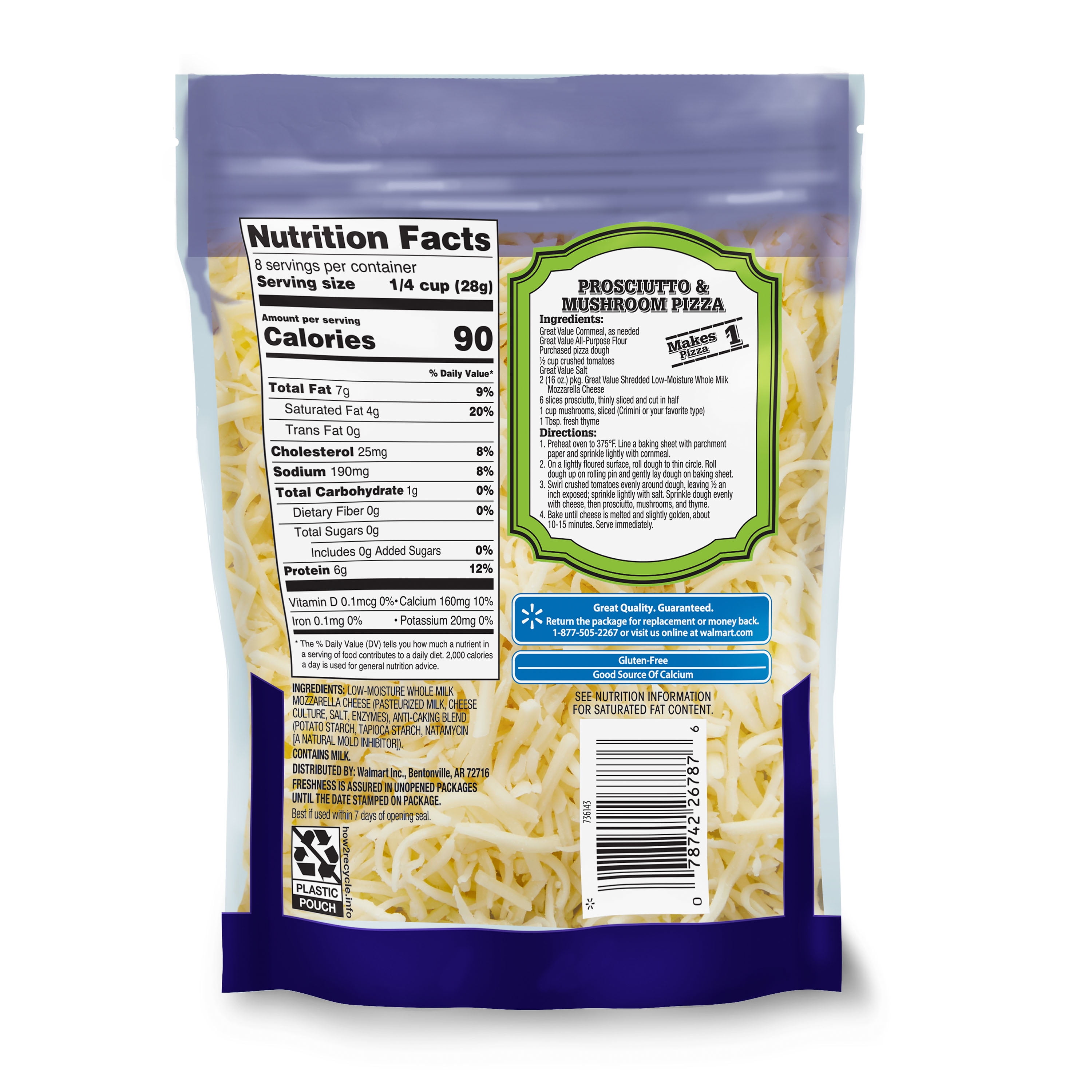 All your family-favorite recipes are a cinch to make with our Great Value Shredded Whole Milk Low-Moisture Mozzarella Cheese. This creamy, mild mozzarella is made with nutritious whole milk and comes pre-shredded to save you on valuable time and effort as you craft pizzas, lasagnas, mac and cheese, and more. It also makes a great garnish for sprinkling on top of soups and stews, and bakes to a savory golden-brown finish when used as a topping for casseroles. With about eight servings per eight-ounce package, you’ll have just the right amount to make your next family dinner night a cheese-filled success! Put away the grater and reach for a bag of our Great Value Shredded Whole Milk Low-Moisture Mozzarella Cheese instead.