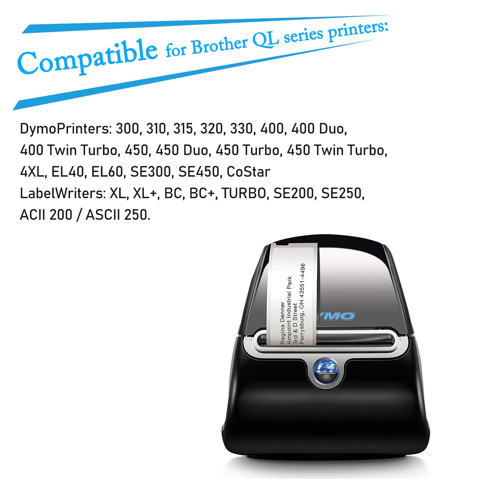 - Compatibility: Dymo Label Writer 300, 310, 315, 320, 330, 400, 400 Duo, 400 Twin Turbo, 450, 450 Duo, 450 Turbo, 450 Twin Turbo, 4XL, EL40, EL60, SE300, SE450; Dymo CoStar LabelWriters XL, XL+, BC, BC+, TURBO, SE200, SE250, ACII 200 / ASCII 250;Seiko SLP 120, 240, Pro, EZ30, and Plus