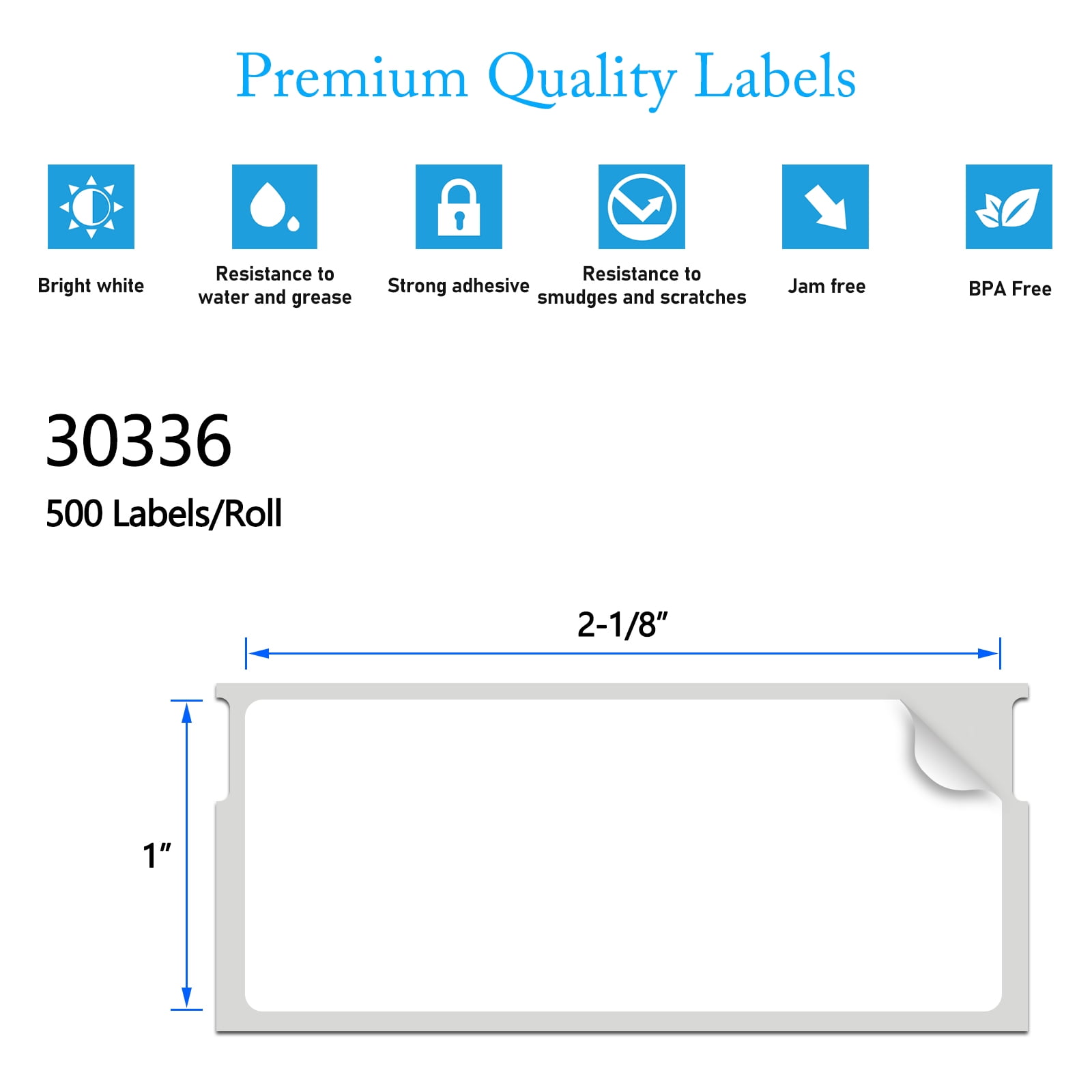 - Width:1"(25mm),Length:2-1/8"(54mm),3-1/8” diameter x 1" width- 1" Core, 500 labels per roll,BPA Free!