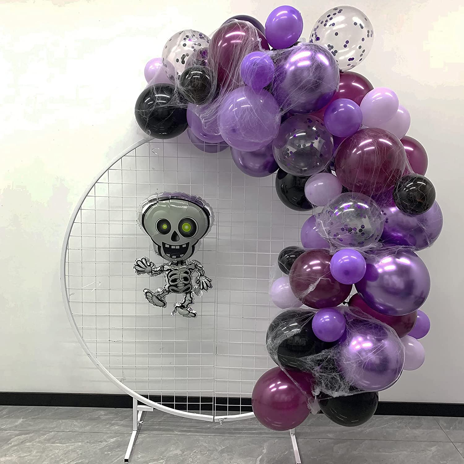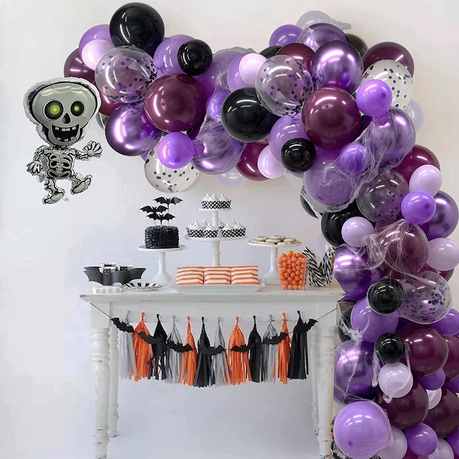 - 【Value Pack】100pcs halloween balloon arch kit including 30pcs black balloons, 40pcs purple balloons, 20pcs burgundy balloons, 5pcs confetti balloons and 1pcs giant skull balloon. 32ft balloon ribbon, 16ft balloon strip tape, 100pcs dot glue, one pack meet all your halloween party decorations need!