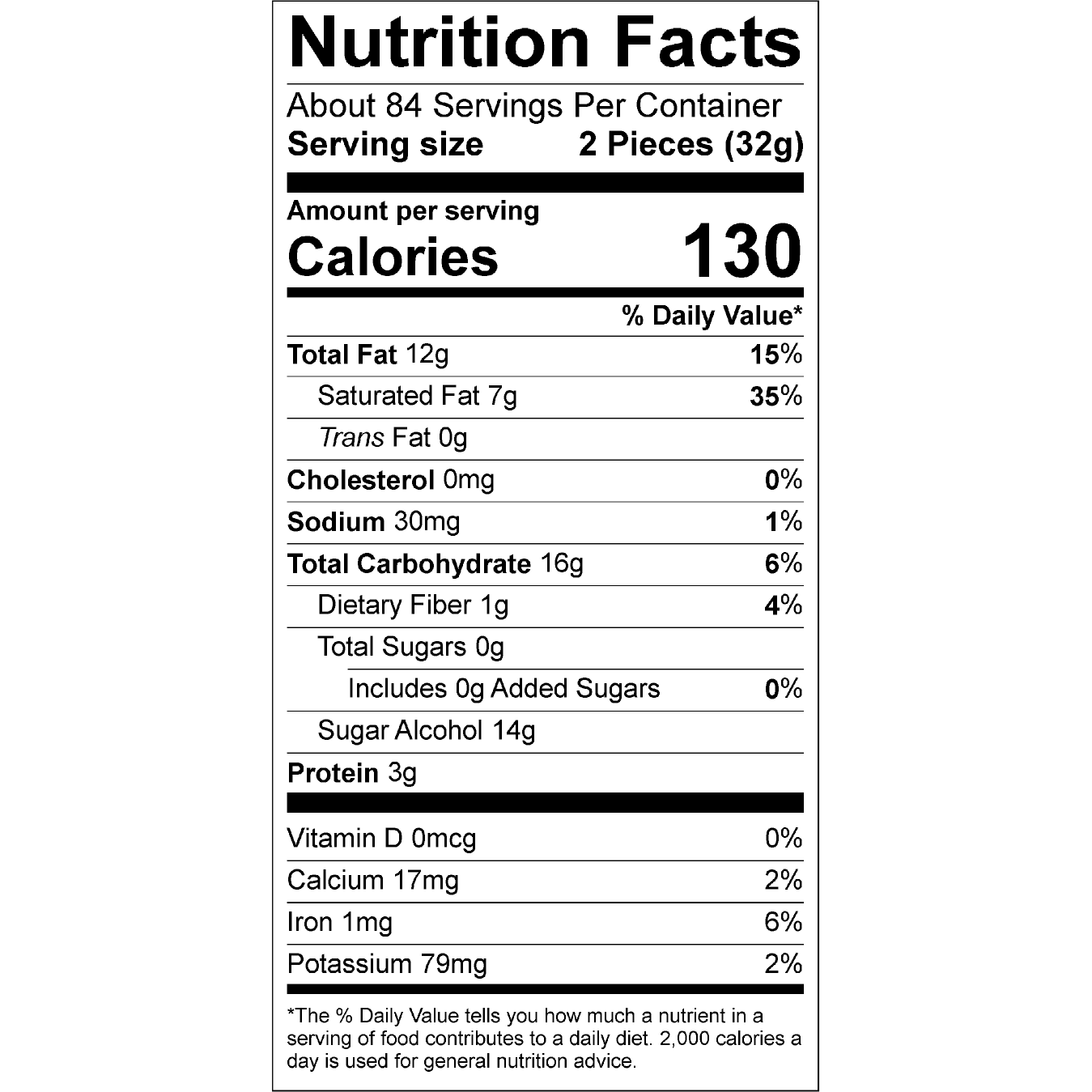 Ingredients: Maltitol, Peanut Butter (Roasted Peanuts, Palm Oil, Salt), No Sugar Added White Confectionary Coating (Palm Kernel Oil, Calcium Carbonate, Whey Protein (Milk), Vanillin), Chocolate Liquor, Cocoa Butter, Milk Fat, Calcium Caseinate (Milk), Hydrogenated Palm Kernel Oil, Sorbitol, Soy Lecithin (an emulsifier), Natural Flavor.