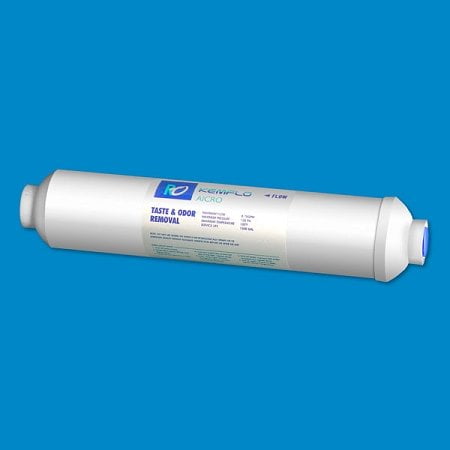 The AICRO-Q filter has built-in quick-connect fittings and is often used as a Reverse Osmosis (RO) inline post filter. It clips on to the membrane housing and filters the water after the bladder tank, acting as a polishing filter. Other applications include: appliances, water coolers, coffee makers, and other low flow applications. Made with Premium Coconut Shell Based Activated Carbon. Maximum Flow: 0.75 GPM (2.84 L/min.) Maximum Pressure: 125 PSI (8.61 bars) Maximum Temperature: 100°F. (38°C.) Service Life: 1500 gallons (5678 L) Connections: 1/4" Quick Connect Fittings built-in on both endsKemflo Aicro AICRO-Q 10 inch x 2 inch GAC Inline Filter with 1/4 inch Quick-Connect Built-In