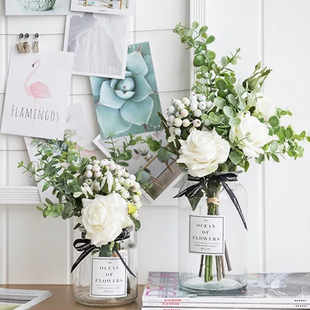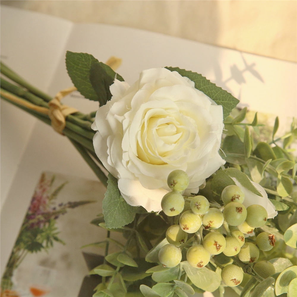 - ☆Fake flowers Roses bouquet has 3 silk flower heads (1 Big and 2 small buds)and eucalyptus leaves and berries, length approx 13.38”.You may bend or prune to create DIY floral arrangements decor that fits perfectly for your satisfying taste.