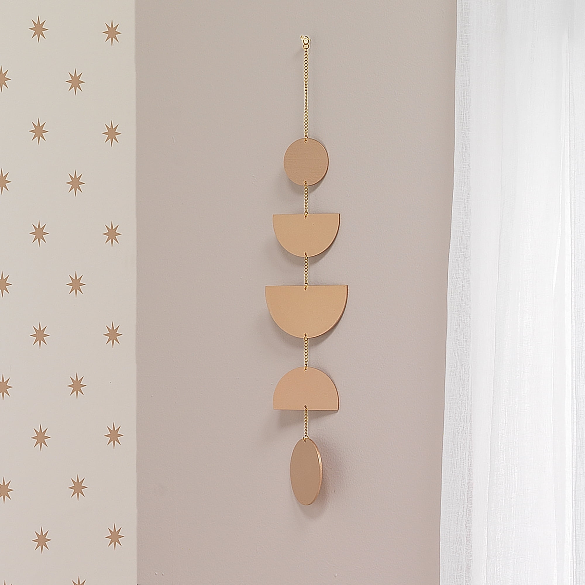 Geometric wooden shapes are painted in trendy gold metallic and connected by a metal chain. There are 3 half circles and 2 full circles. The geo shapes are made of plywood and are perfect to add a designer look to your nursery walls.