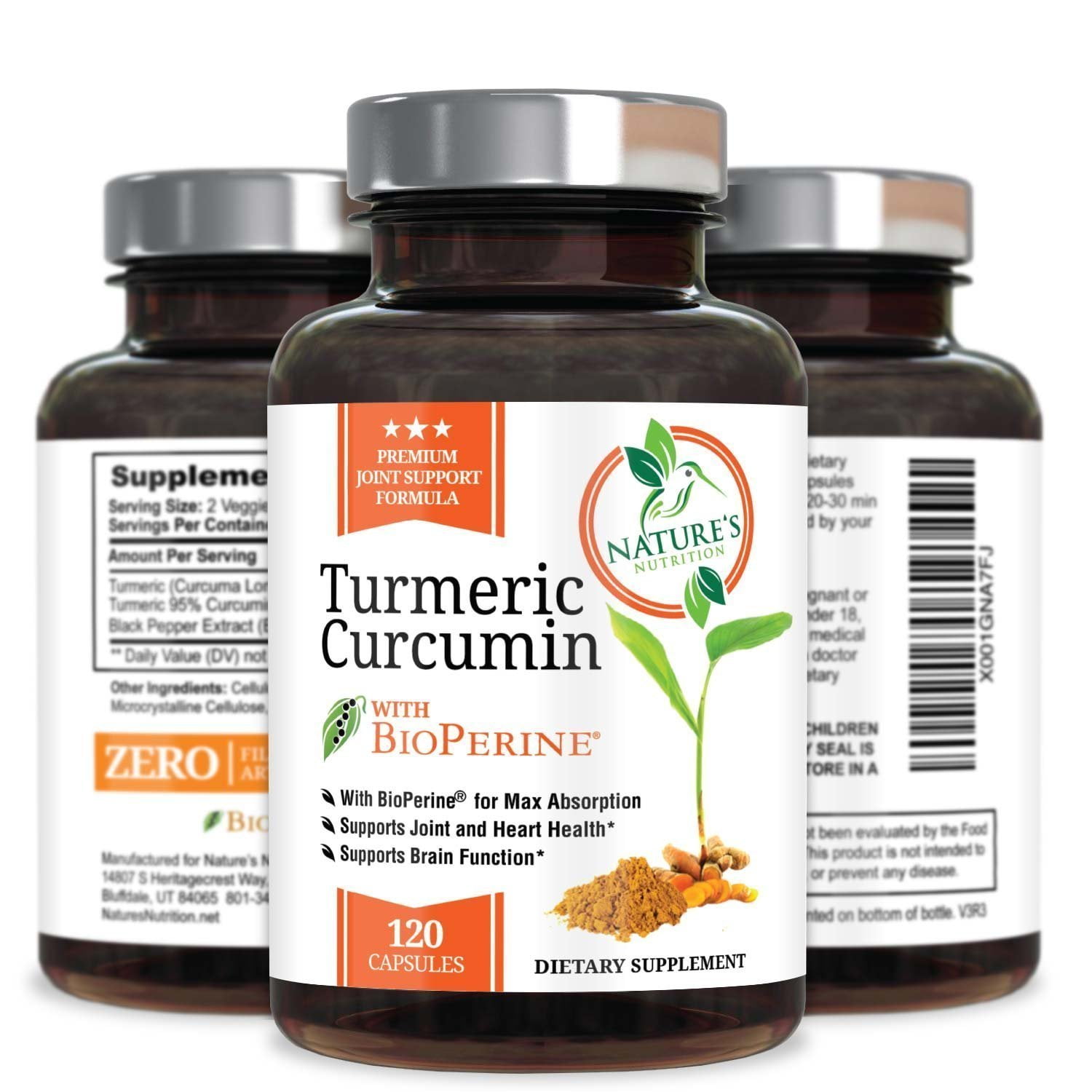 Turmeric root (Curcuma longa), the spice that gives curry it’s yellow color, is a perennial plant from the ginger family. The root is boiled, dried and ground to make turmeric powder, a primary ingredient in curries, and is a very effective nutritional supplement. Turmeric has been shown to be one of the most powerful herbs on the planet, by dramatically increasing the antioxidant capacity of the body. Turmeric curcumin has been used as a natural and safe herb for centuries, and has been shown to support joint health. Ingredients: Turmeric (Curcuma Longa) (root): 2,400mg Turmeric 95% Curcuminoids: 200mg BioPerine Black Pepper Extract: 20mg Inactive Ingredients: Cellulose (Veggie Cap), Microcrystalline Cellulose, Silicon Dioxide. Each serving of Nature’s Nutrition Turmeric Curcumin with Black Pepper Extract, with 95% curcuminoids, contains 2,400mg of turmeric, 200mg of turmeric curcuminoids, and 20mg of BioPerine black pepper extract, which helps increase absorption and bioavailability by as much as 2,000 times. Our turmeric curcumin extract with black pepper is a natural, gmo free turmeric supplement in vegan friendly.