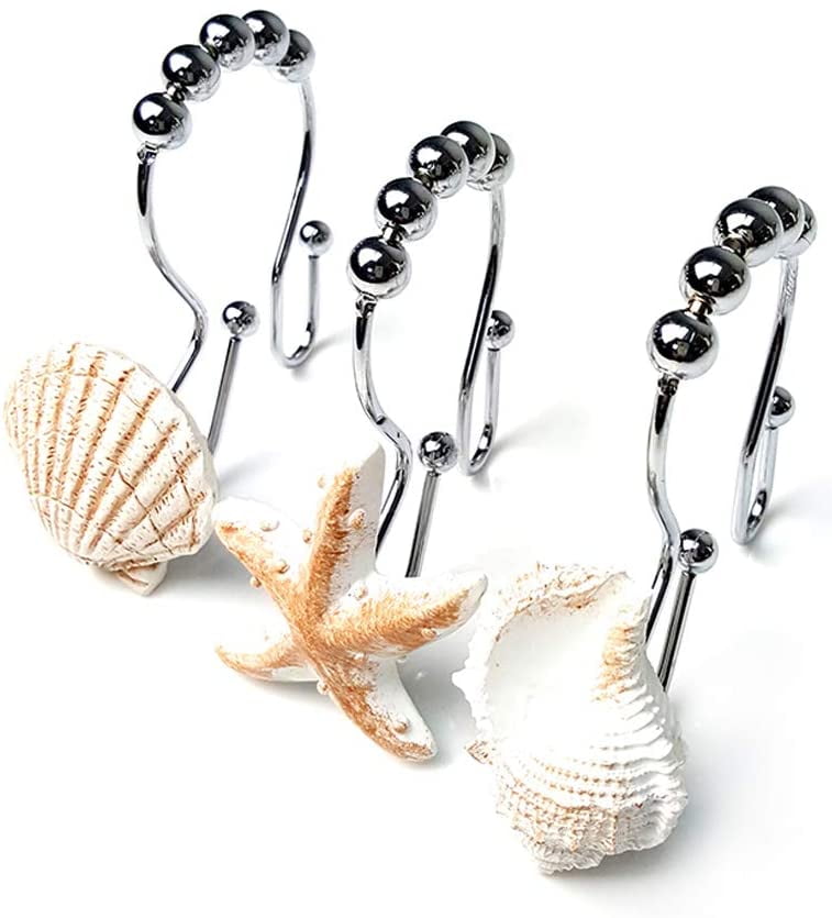 Ocean Decorative Shower Curtain Hooks Rust Proof,Stainless Steel Shower Curtain Rings with 5 Glide Rollers for Bathroom and Shower Set of 12-Hook