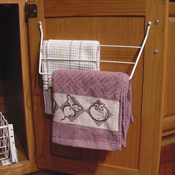 Store your dish towels where you need them – right under the kitchen sink. This towel holder is made of wire and easily fastens to any cabinet door, holding up to three dish towels. Wasted space is a thing of the past. Contains (1) white towel holder with mounting screws. Includes a limited lifetime manufacturer’s warranty.