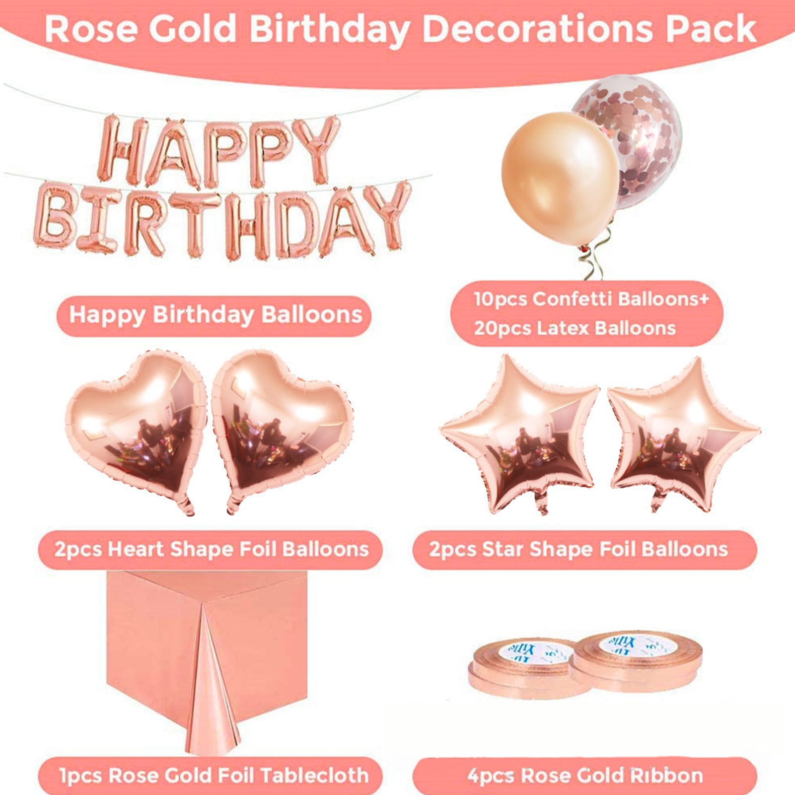 Rose Gold Birthday Party Decorations Set Girls Women Baby Birthday Party Supplies Happy Birthday Balloons Ribbons Curtains Tablecloth For Baby Birthday Party Decorations