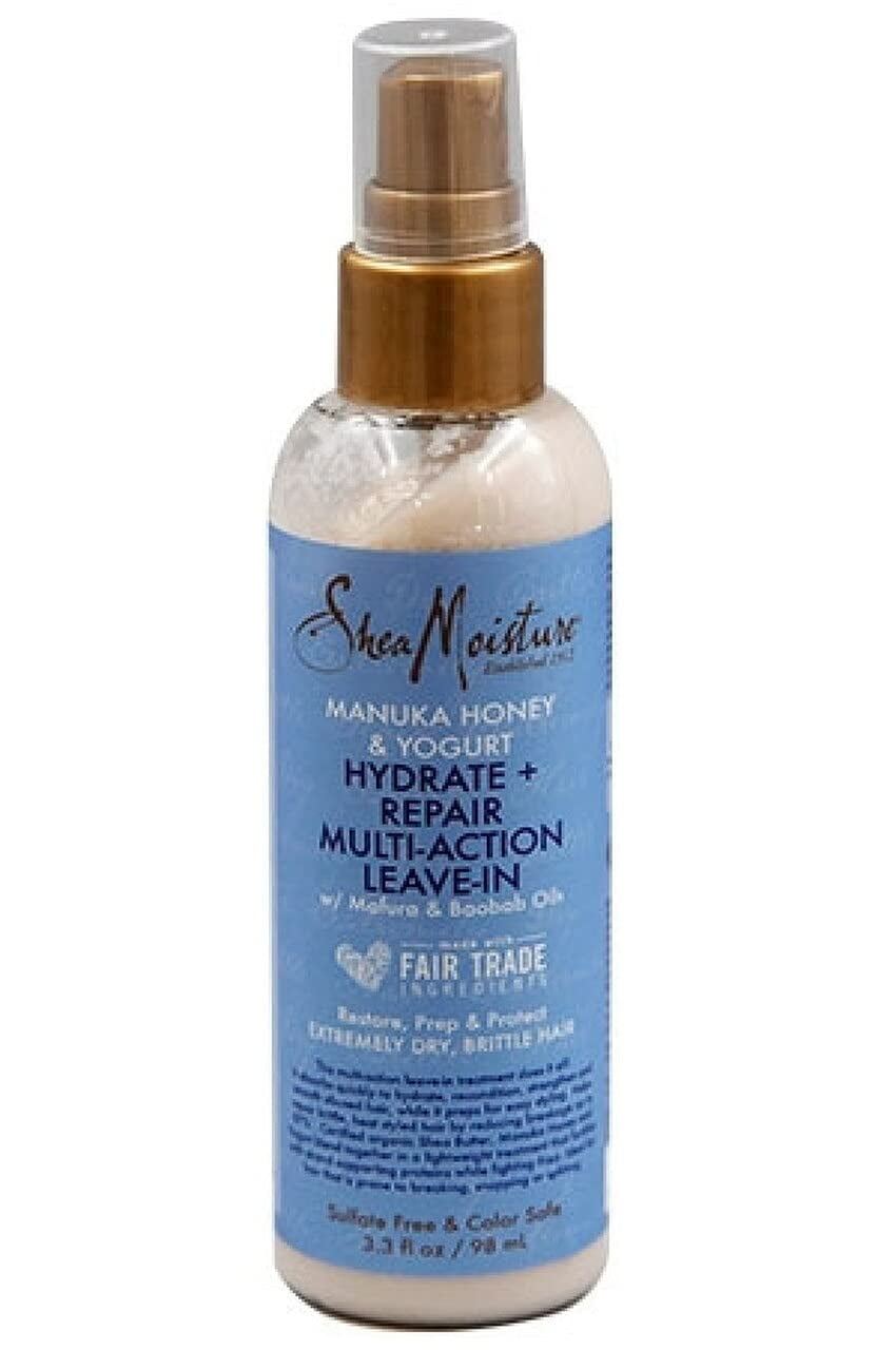 [SheaMoisture’s Manuka Honey] SheaMoisture’s Manuka Honey & Yogurt Hydrate + Repair Multi-Action Leave-In does it all! It absorbs quickly to hydrate, recondition, strengthen and smooth abused hair, as well as preps for easy styling. SheaMoisture’s Manuka Honey & Yogurt Hydrate + Repair Multi-Action Leave-In does it all! It absorbs quickly to hydrate, recondition, strengthen and smooth abused hair, as well as preps for easy styling. Protects brittle hair from high heat up to 450 degrees, while reducing breakage up to 87%*. Certified organic Shea Butter, reparative Manuka Honey and yogurt blend together in a lightweight treatment that fortifies hair with strand supporting proteins while fighting frizz. Ideal for hair that is prone to breaking, snapping or splitting.*Tested on non-chemically treated hair.Key Ingredients:Manuka Honey-This formula with Manuka Honey helps provide moisture and boost shine.Yogurt Extract-This formula with Yogurt Extract adds nourishing moisture to your hair.Mafura Oil-This damage control formula with natural Mafura Oil softens and promotes healthy-looking hair.SheaMoisture’s Story: Sofi Tucker started selling Shea Nuts at the village market in Bonthe, Sierra Leone in 1912. By age 19, the widowed mother of four was selling Shea Butter, African Black Soap and her homemade hair and skin preparations all over the countryside. Sofi Tucker was our Grandmother and SheaMoisture is her legacy. Through Community Commerce you help empower disadvantaged women to realize a brighter, healthier future.Discover your Shea here![SheaMoisture’s Manuka Honey] SheaMoisture’s Manuka Honey & Yogurt Hydrate + Repair Multi-Action Leave-In does it all! It absorbs quickly to hydrate, recondition, strengthen and smooth abused hair, as well as preps for easy styling. SheaMoisture’s Manuka Honey & Yogurt Hydrate + Repair Multi-Action