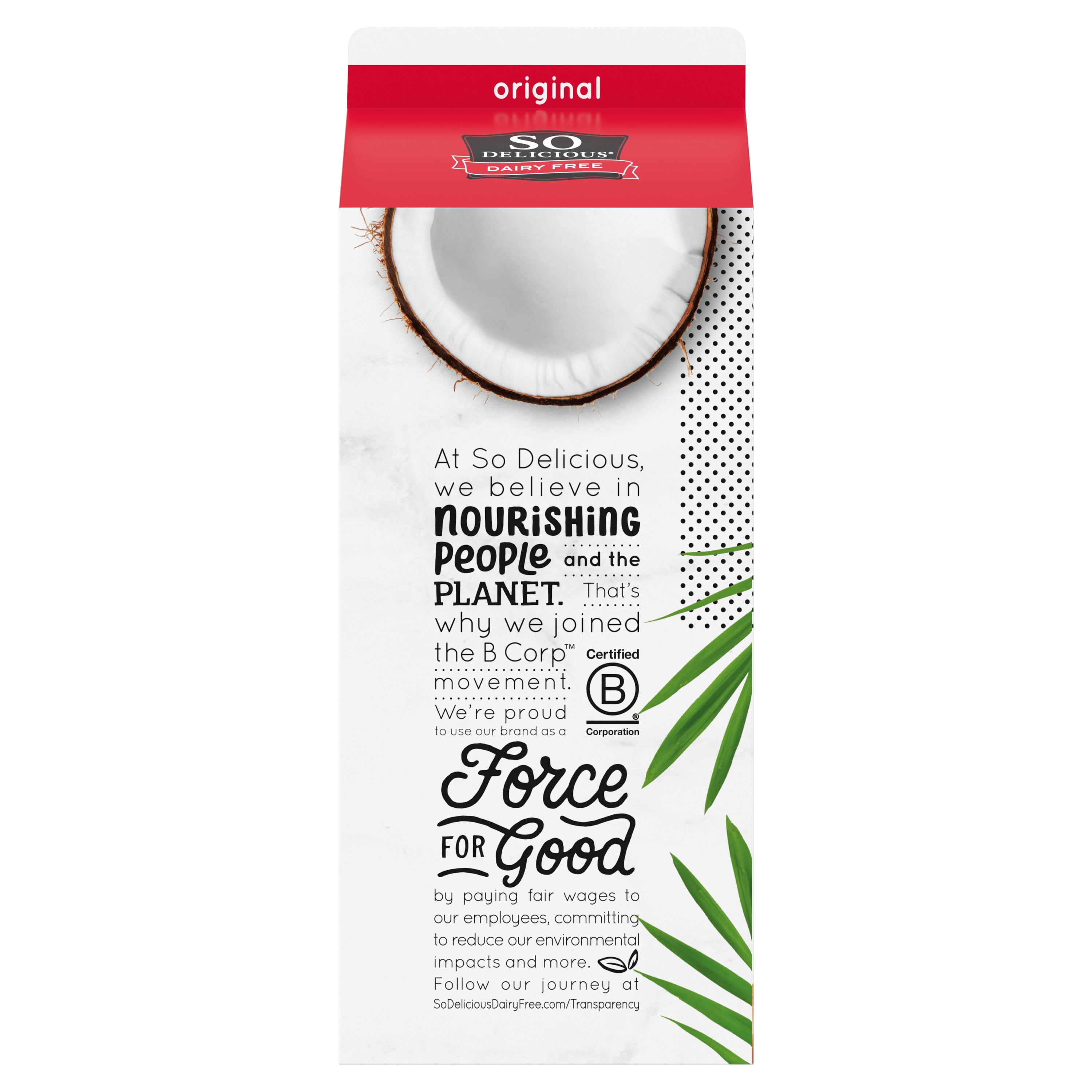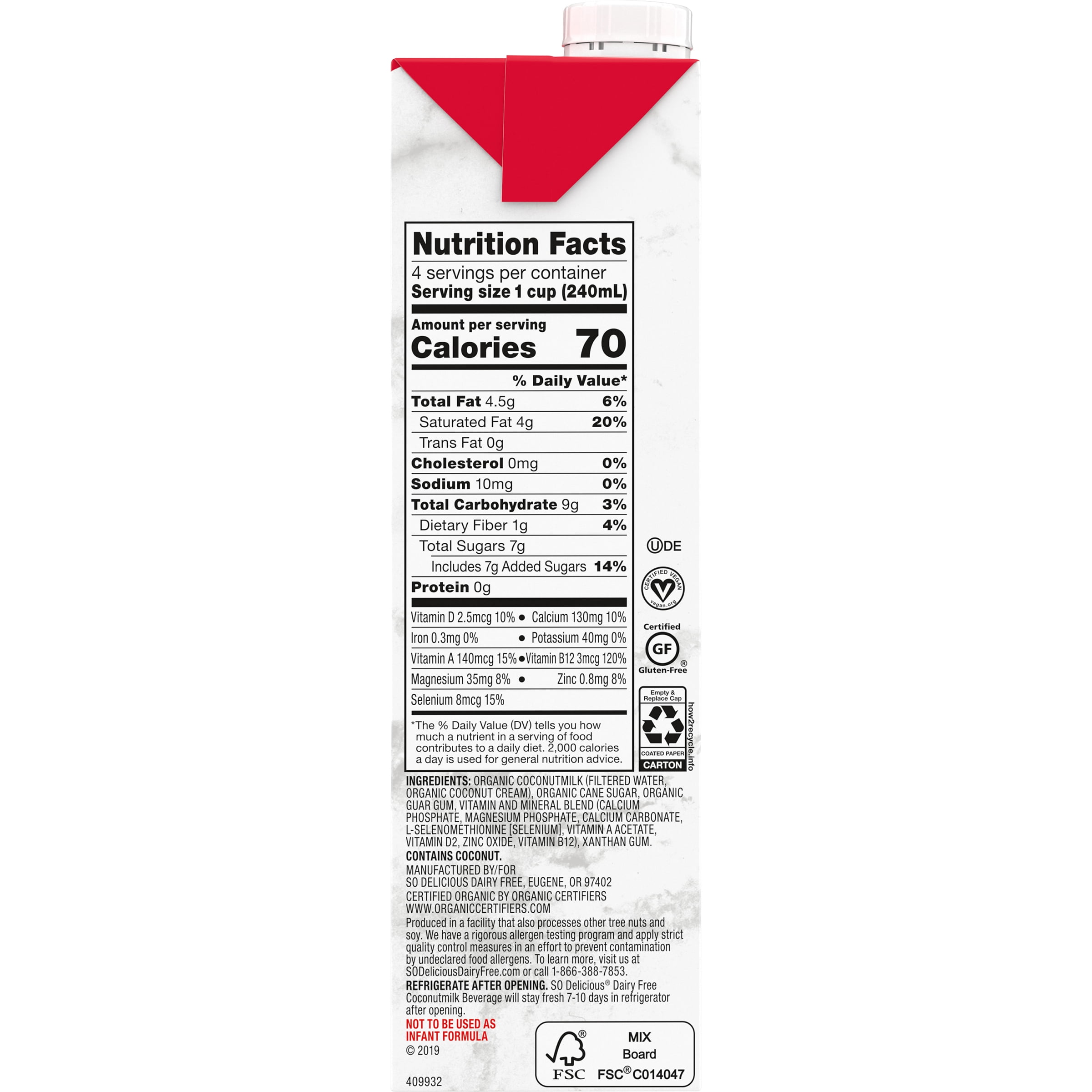 SO DELICIOUS ORIGINAL COCONUT MILK IS A 100% USDA-CERTIFIED ORGANIC BEVERAGE. THIS CERTIFIED GLUTEN-FREE COCONUT MILK COMES IN ONE 1 QT. CARTON AND CONTAINS 0 G. OF TRANS FAT OR CHOLESTEROL. IT IS CERTIFIED KOSHER-PARVE AND CERTIFIED VEGAN, AND EACH SERVING CONTAINS JUST 70 CALORIES. SEE NUTRITION FACTS PANEL FOR ALLERGENS.So Delicious Coconut Milk Beverage Original, 32 Fl Oz