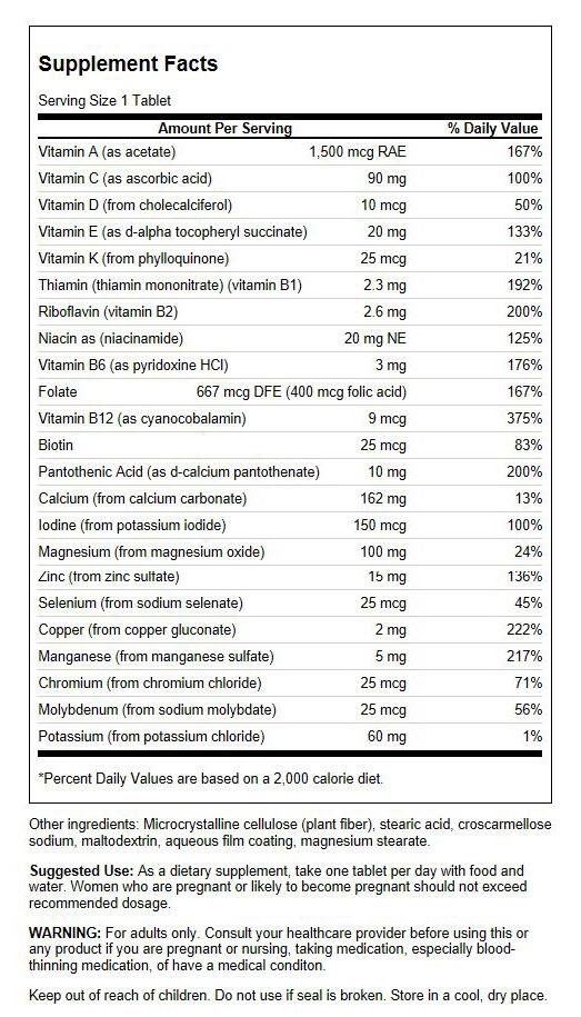 - Provides a full-day’s supply of 15 essential vitamins and minerals