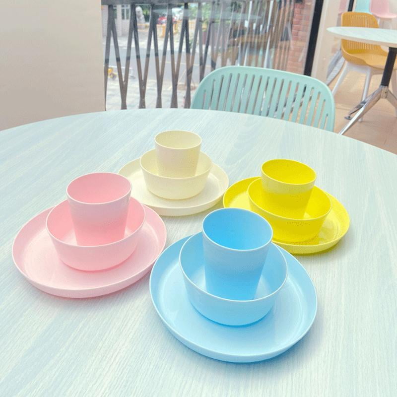 - 12 piece set – 4 plates, 4 bowls and 4 cups in stylish pastel colours.
