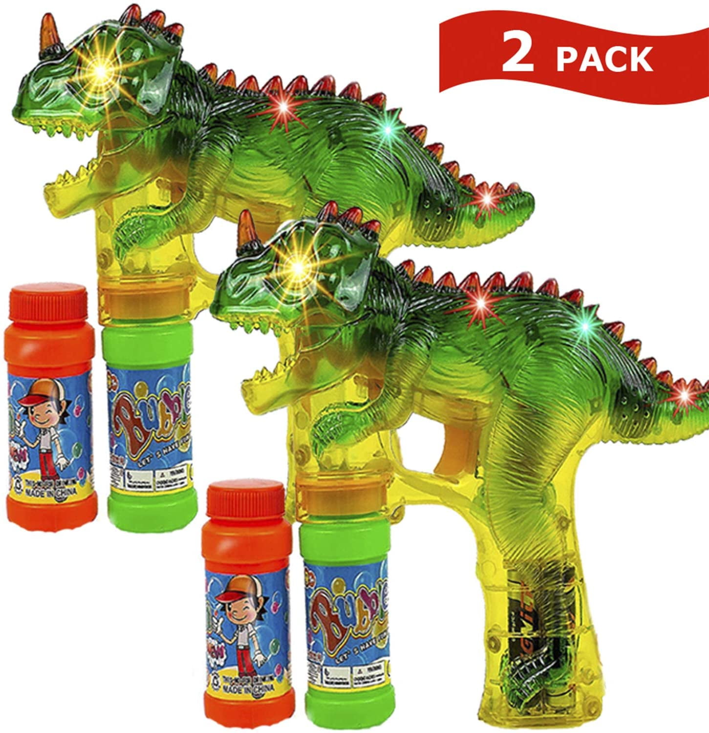 Toysery Dinosaur Bubble Blower Gun for Kids, 2 Pack Light Up Bubble Blaster Guns with Extra Refill Bottles Solution, Sound and LED Flashing Lights Effect Bubble Shooter Gun for Toddler Boys and Girls