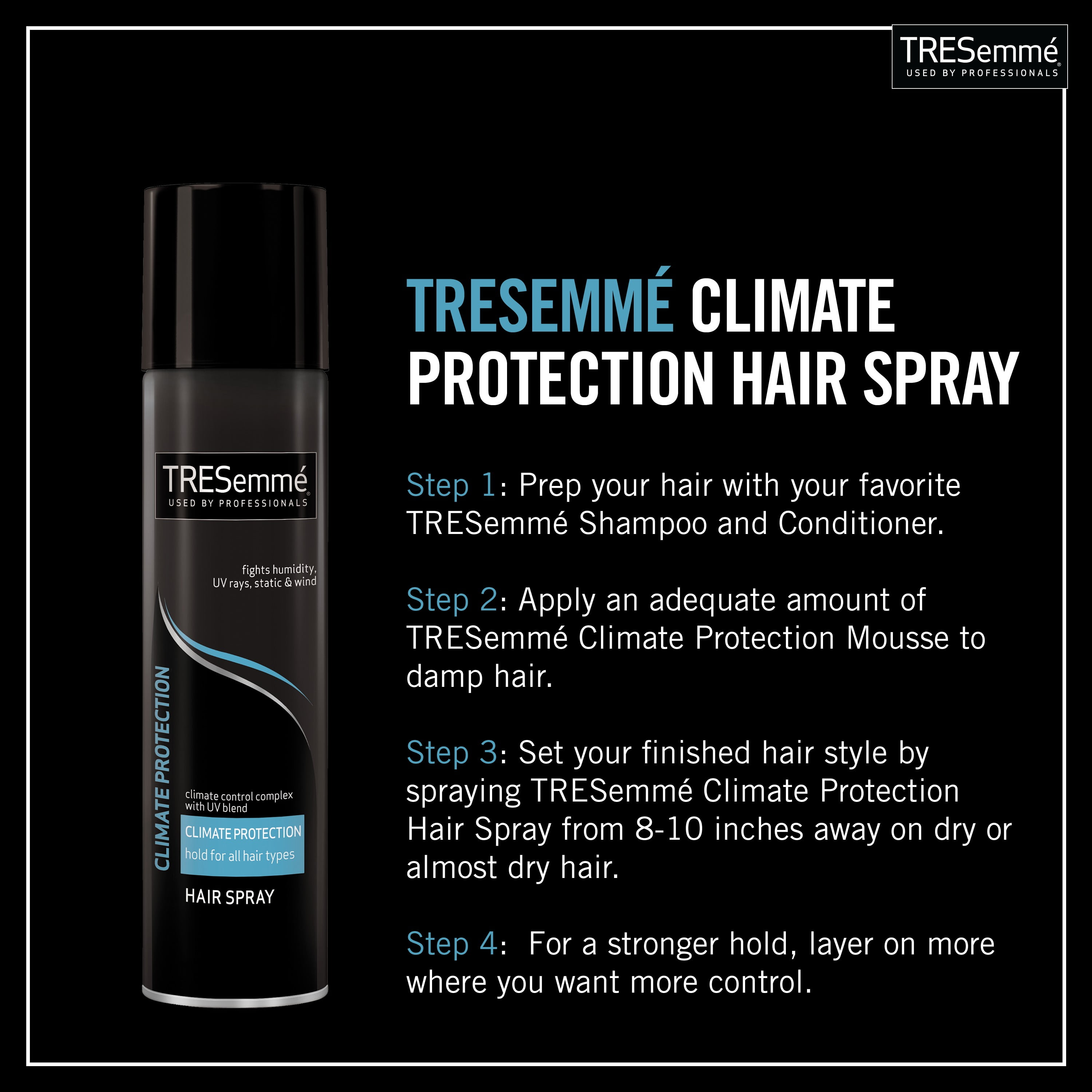 Bad weather should never wreck your style. When humidity hits, protect your hair with TRESemme Climate Protection Finishing Hair Spray for a flexible, frizz-controlled hold and vibrant finish. An extra hold hairspray. Whether the forecast calls for wind, rain, or unmanageable humidity, the elements can be your hair?s worst enemy. On days you need flexible hold and protection from humidity, static or wind, use TRESemme Climate Protection Finishing Spray to create a touchable, climate-controlled hold. Before you lock in your style, wash with TRESemme Climate Protection Shampoo and Conditioner to gently cleanse and moisturize hair while controlling frizz, and apply TRESemme Climate Protection Mousse. Then weather the storm with your style sealed in using our anti frizzTRESemme Climate Protection Finishing Hair Spray with Climate Control Complex for supreme protection against humidity, wind and static all day long. Step 1: Prep your hair with TRESemme Climate Protection Shampoo and Conditioner. Step 2: Apply an adequate amount of TRESemme Climate Protection Mousse to damp hair. Step 3: Set your hairstyle by spraying climate protection hair spray 8-10 inches away on dry or almost dry finished hairstyle. For a strong hold, layer on more coats where you want more control. Our TRESemme Climate Protection Finishing Hair Spray provides flexible hold to protect any hairstyle from weather.
