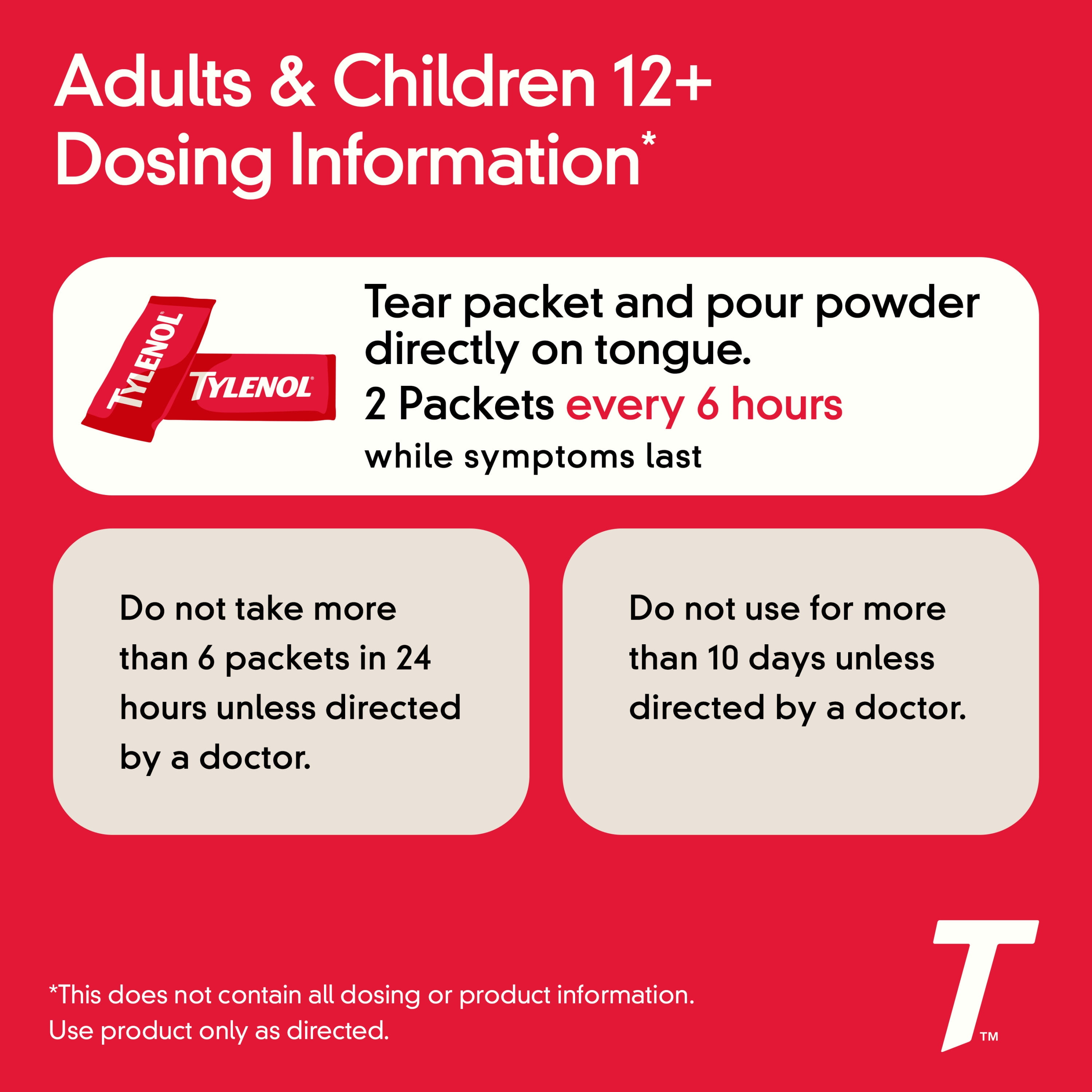 Relieve pain and fever whenever they hit with Tylenol Extra Strength Dissolve Packs with Acetaminophen. From the #1 doctor recommended brand of pain reliever, this extra strength oral pain reliever medicine for adults provides temporary relief from minor aches and pains due to headache, backache, minor pain of arthritis, muscle aches, menstrual and premenstrual cramps and toothache. Each pain reliever powder packet contains 500 milligrams of acetaminophen, an effective pain relief medicine and fever reducer that is safe when used as directed. No water, no problem. This portable pain relief powder dissolves in seconds on the tongue–no water needed. With a convenient on-the-go form to have on hand whenever pain hits, the pain medicine is ibuprofen- and aspirin-free with a great tasting berry flavor. Tylenol Extra Strength Dissolve Powder Packs with Acetaminophen can be used by adults and children 12 years of age and older.