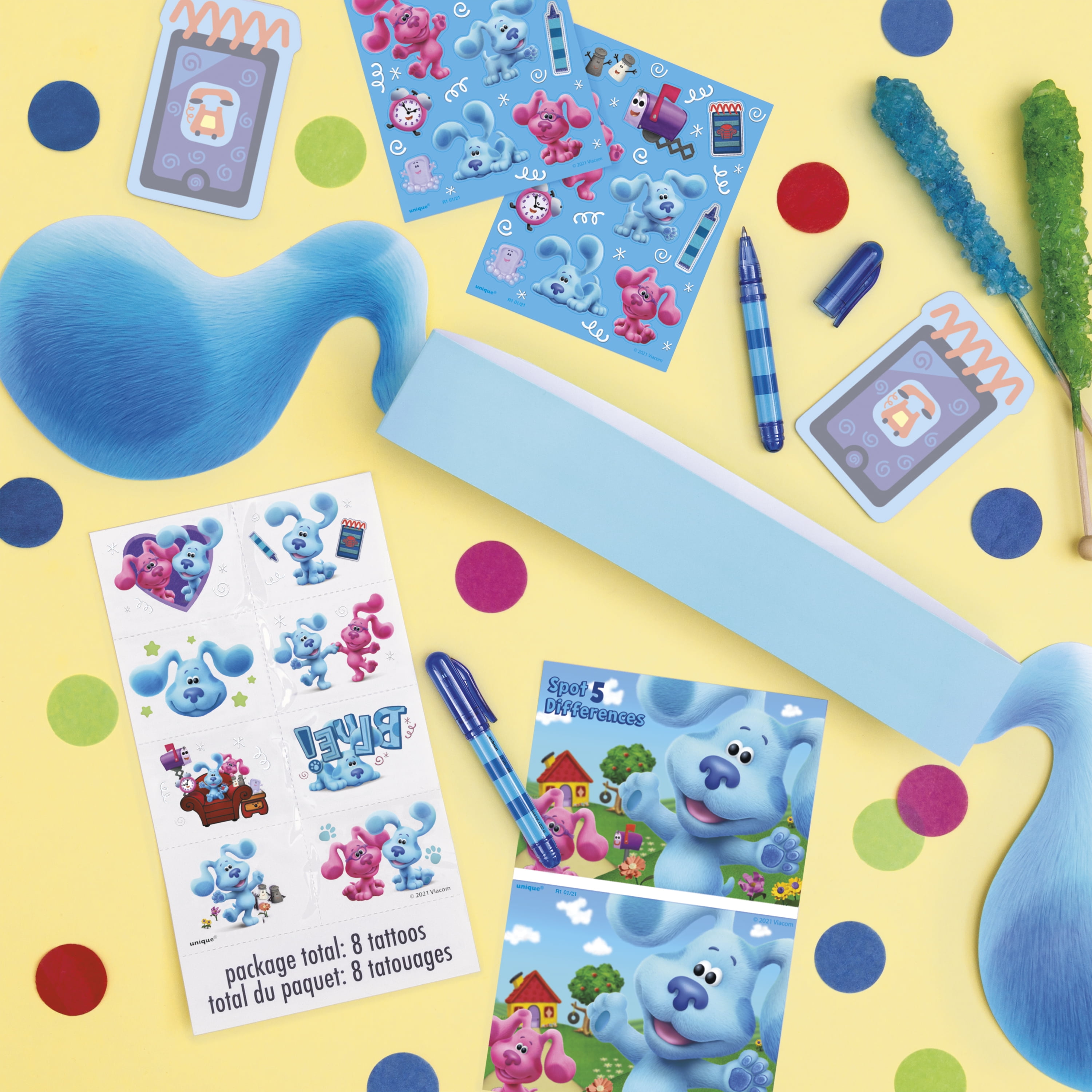 Unique Industries Get ready for some paw-ty fun with our Blue’s Clues Birthday Party Favor Kit. This pack of 48 party favors features Blue, Magenta, and more of the crew perfect for your Blue’s Clues birthday party. In this kit, you’ll find 8 paper ears, 8 mini pens, 8 sticker sheets, 8 kids tattoos, 8 activity sheets, 8 notepads. Use these favors to fill goodie bags or award as game prizes. Find more ways to celebrate with your party pups and shop the rest of our budget-friendly Blue’s Clues themed party supplies.
