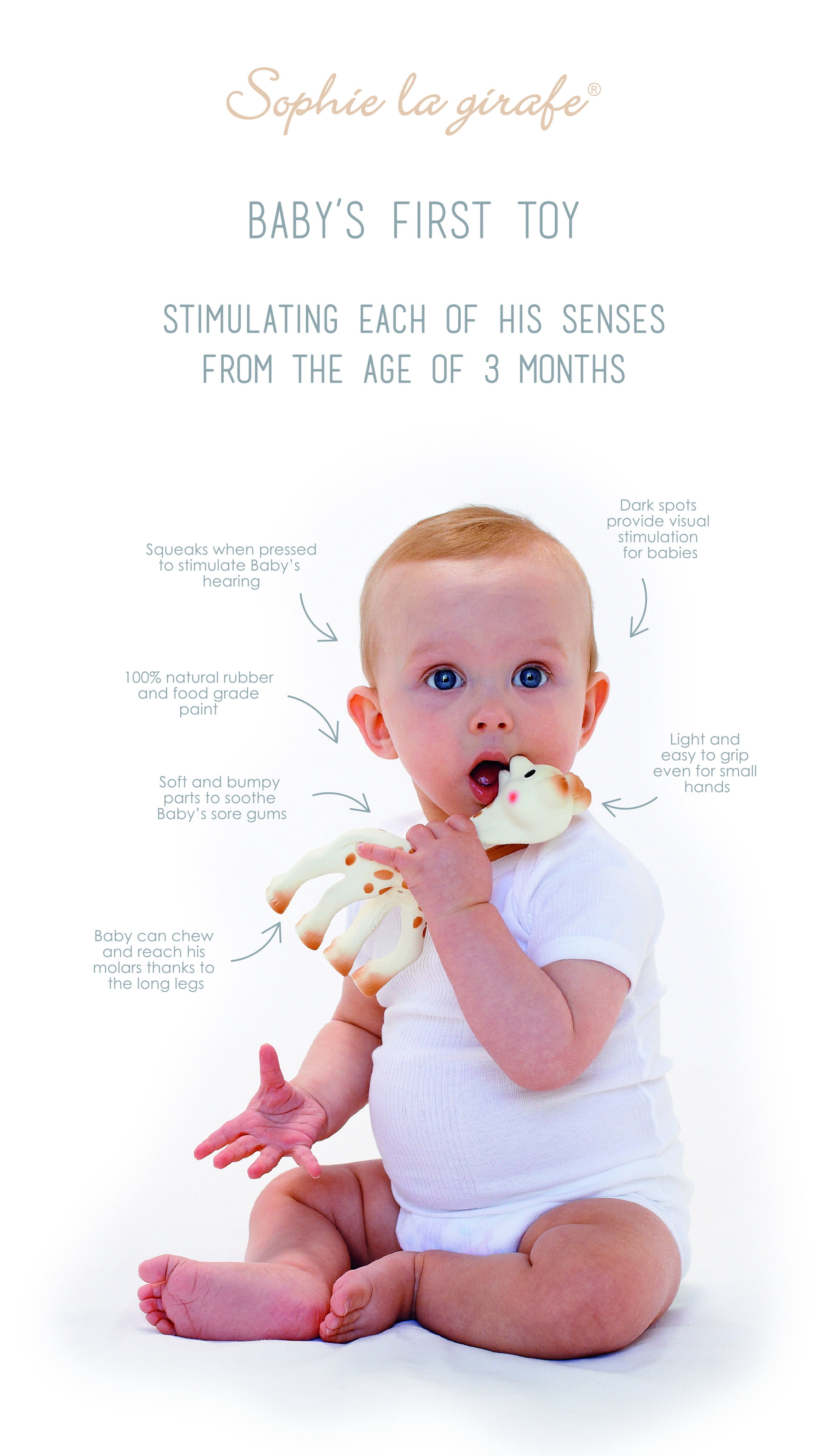 Born in France in 1961, Sophie the Giraffe has a long history of helping teething babies. Derived from natural rubber and food paint, she is safe to chew. Her shape is easy for the baby’s hands to grasp, and she makes a delightful squeak when her tummy or head are squeezed. Inside each box, you’ll receive a booklet to discover more products, The Sophie story and on each box, there is a QR code to authenticate your Sophie.
