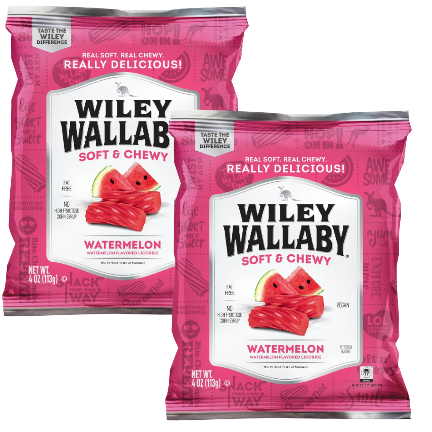 Wiley Wallaby Watermelon Licorice 4oz. Bag Gourmet Australian Style Soft & Chewy Licorice Candy Twists Great for Snacks Movie Nights Picnics Halloween Goody Fillers & Birthday Party Favors 2 Packs