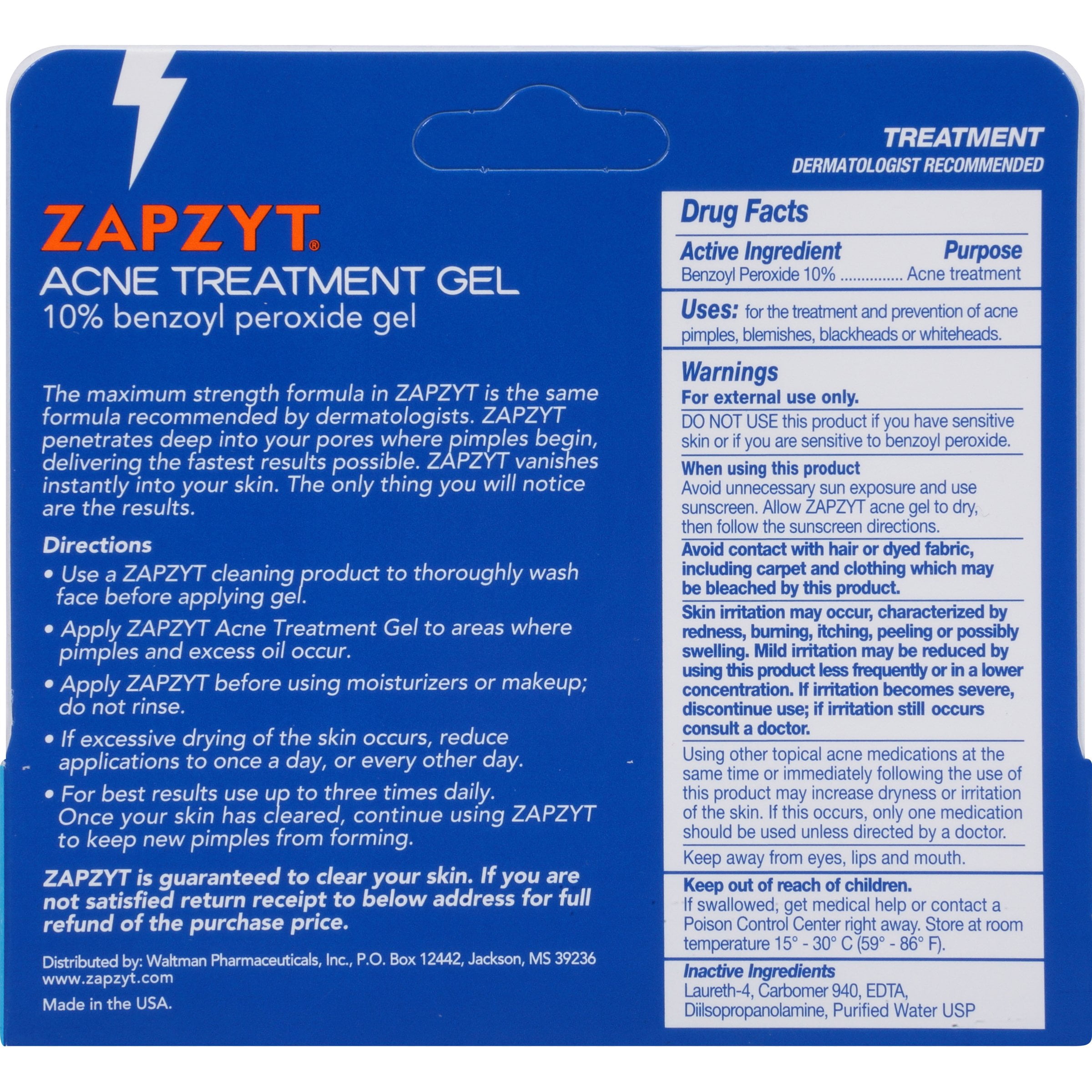 ZapZyt Acne Treatment gel – Kills 99% of Acne Causing Bacteria – 1 oz10% benzoyl peroxide gelThe maximum strength formula in Zapzyt is the same formula recommended by dermatologists. Zapzyt penetrates deep into your pores where pimples begin, delivering the fastest results possible Zapzyt vanishes i