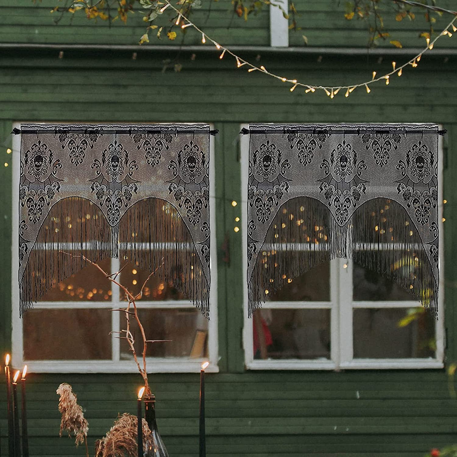ZeeDix Halloween window curtains are made of 100%polyester and lace. Very good quality with unique skull and bat pattern and tassle, can be used both indoors and outdoors You can easily hang the banner anywhere you want. It perfects for Halloween party decoration and the tassel design helps you create a great mystrey party atmosphere.Transparent lace curtain will not block the light and will not darken the room.The curtain can be easy to store and reuse.