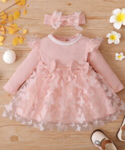 PatPat 2pcs Baby Girl Pink Mesh Dress Set,Ribbed Long Sleeve Splicing 3D Butterfly Appliques Princess Dress Pageant Party Birthday Wedding Flower Girl Dress,0-3t